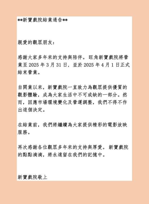 新寶戲院原址為1984年開業嘅金聲戲院,通告解釋因應市場環境變化同營運調整,不得不作出結業嘅艱難決定。新寶戲院表示,結業前將繼續為大家提供精彩電影放映服務。亦再次感謝觀眾多年來支持同厚愛。新寶戲院嘅點點滴滴,將永遠留於記憶之中。![]()