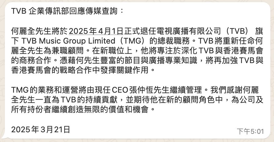 何麗全先生將於2025年4月1日正式退任電視廣播有限公司(TVB)旗下TVB Music Group Limited(TMG)的總裁職務。TVB將重新任命何麗全先生為兼職顧問。在新職位上,他將專注於深化TVB與香港賽馬會的商務合作。憑藉何先生豐富的節目與廣播專業知識,將再加強TVB與香港賽馬會的戰略合作中發揮關鍵作用。