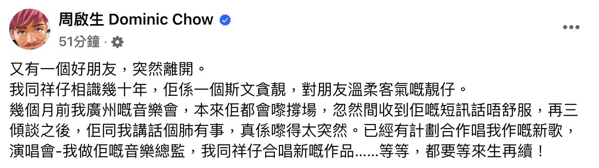歌手 李國祥 離世,終年60歲。 佢上星期於社交平台Post出陰暗天空嘅影片,加上一句「Bye」,唯未引起太多注意。其好友周啟生接受傳媒訪問時證實李國祥已離世,又指對方肺部有類似腫瘤嘅嚴重問題,需接受大手術,又指對方係一個好人。