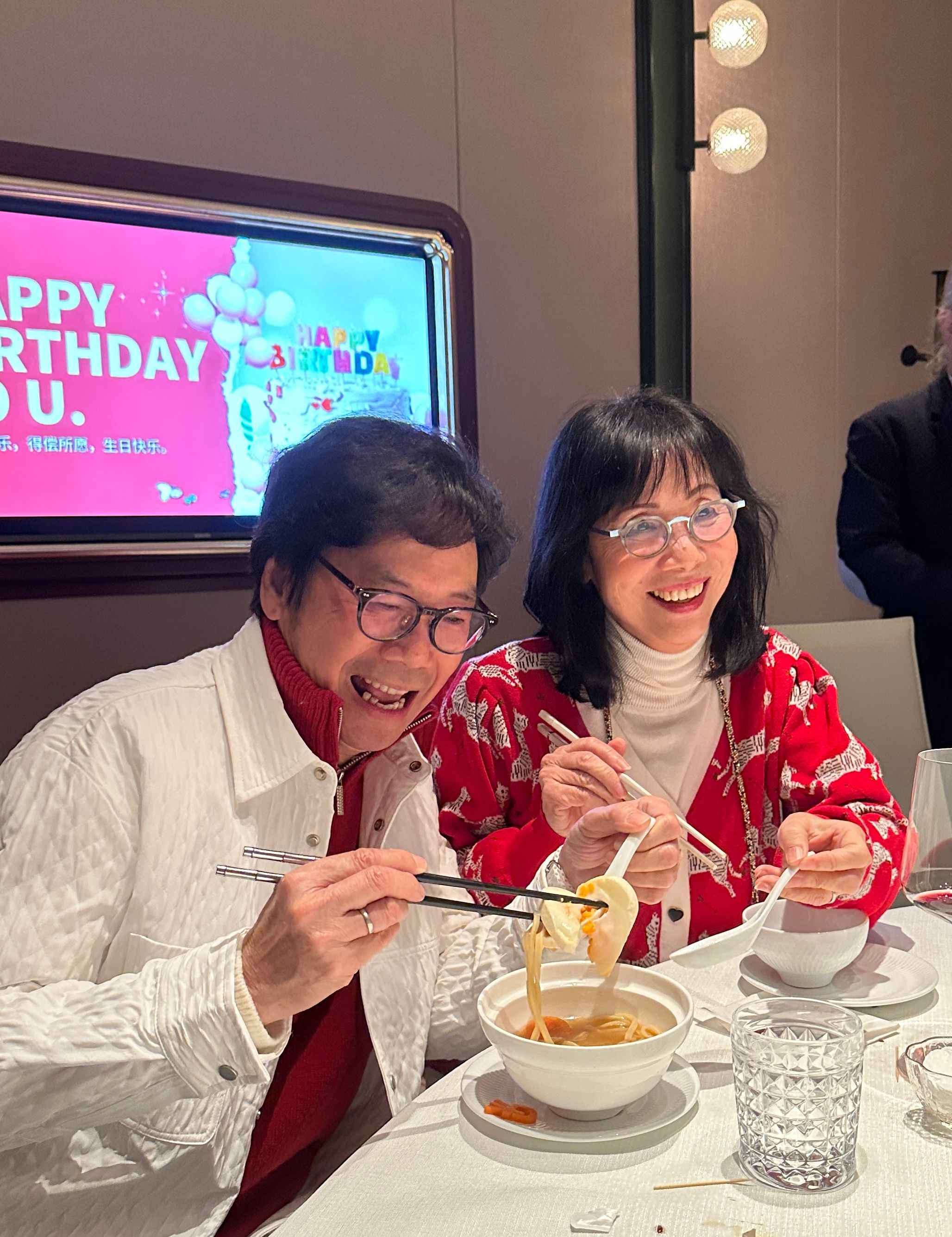 而同佢早於70年代已成婚嘅太太Mona,亦早以為靈魂伴侶慶祝,喺另一場合送上壽桃同「菲林」芝麻卷祝賀丈夫。早於月頭已開始連串慶祝活動嘅健仔,連日來飯局不斷,慶祝活動一浪接一浪。