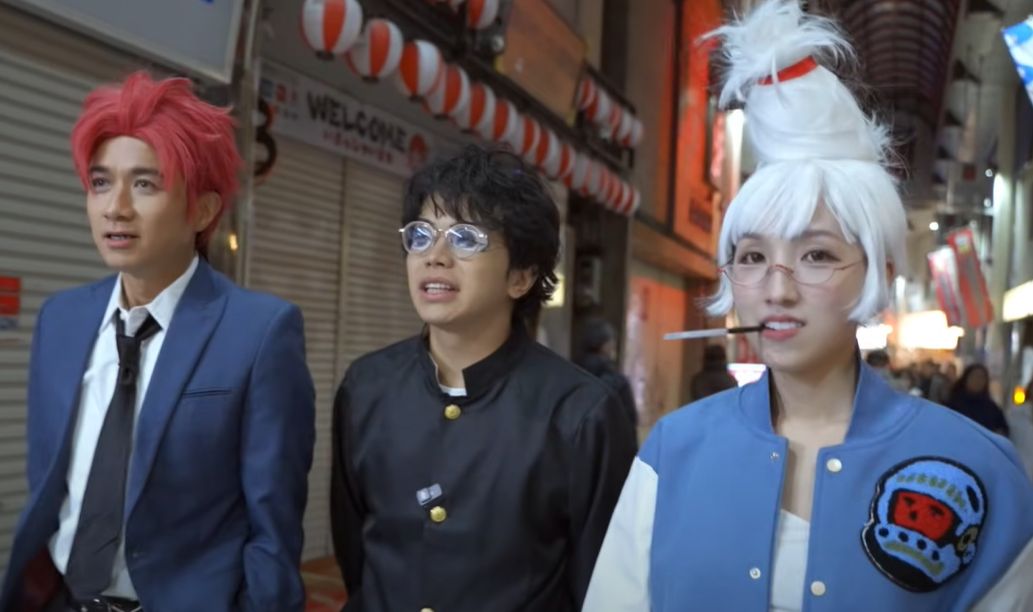 最後基仔Cosplay円城寺仁、程人富扮演高倉健、海兒就化身Seiko Ayase,一齊喺大阪街頭喪玩,又特登走到人多嘅地方遊走,基仔笑言:「今日我地搞到呢個look,要練嘅係乜嘢呀?膽大呀!因為係《膽大黨》吖嘛!無論見到所有人佢地望我地嘅目光係點,我地仍然自信。」更吸引唔少途人圍觀兼拍照。![]()