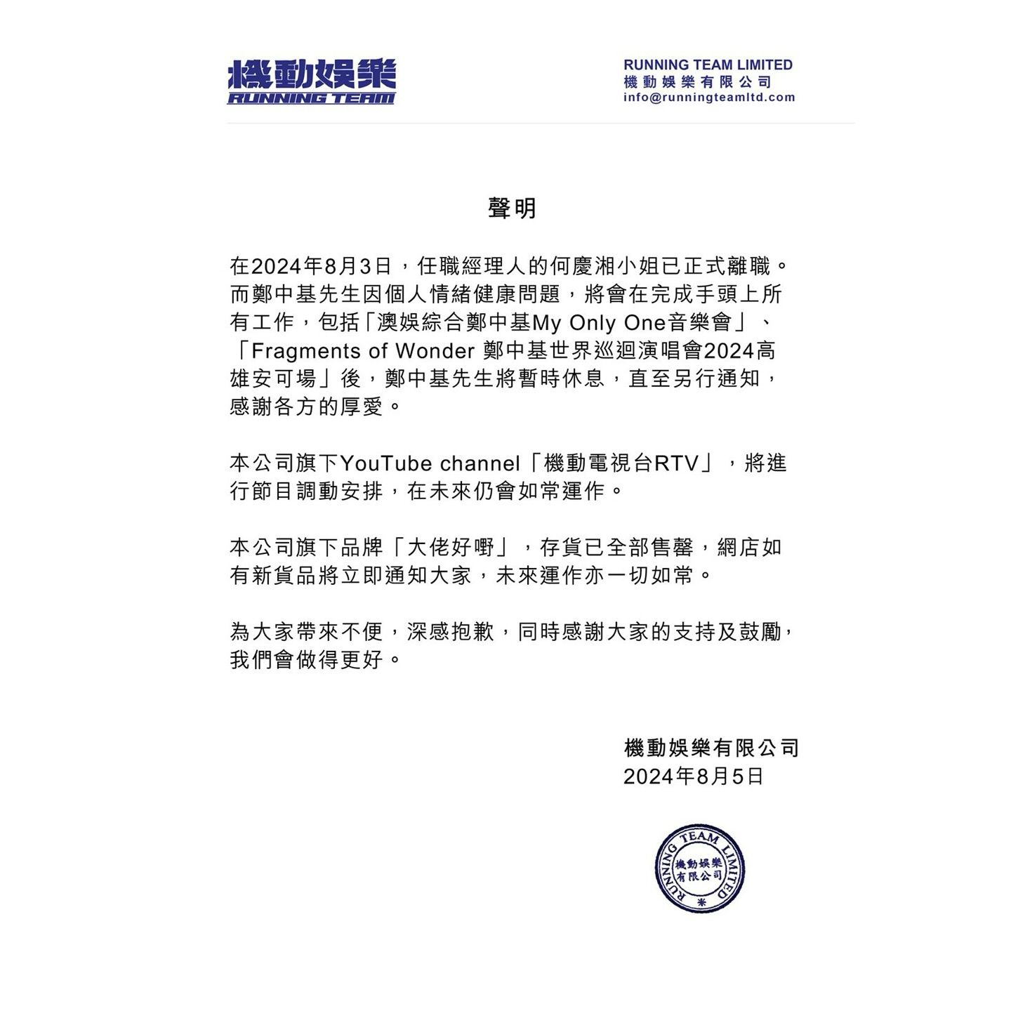 Ronald喺去年8月初宣布因發現合作10年嘅經理人何慶湘「工作及道德操守有問題」,終止對方同「機動娛樂」嘅合作。其後佢再發聲明指患上抑鬱症同再次以飲酒逃避問題,決定喺太太Sammie陪同下到美國接受戒酒療程。而喺Ronald宣布同何慶湘中止合作前,Sammie曾喺社交平台貼出一張疑似地毯相寫將有大事來臨。![]()