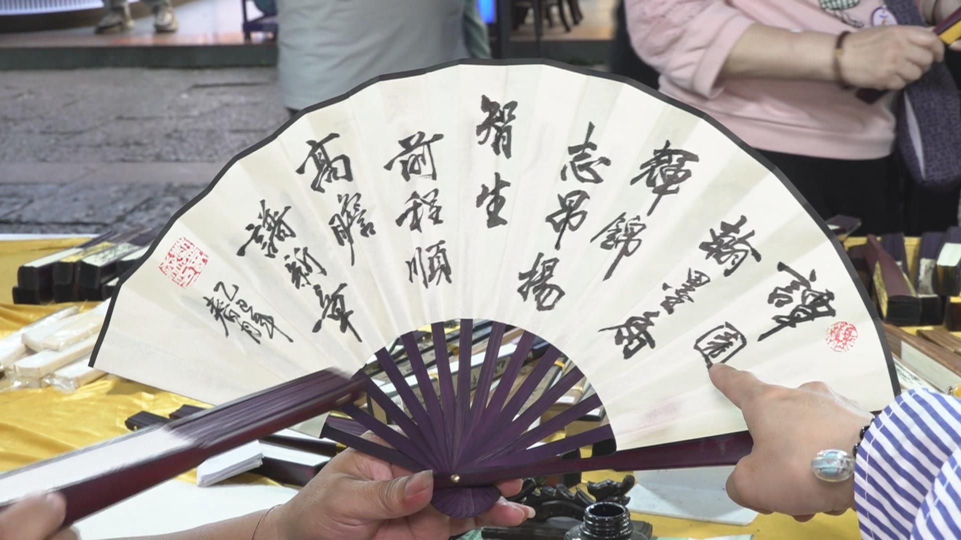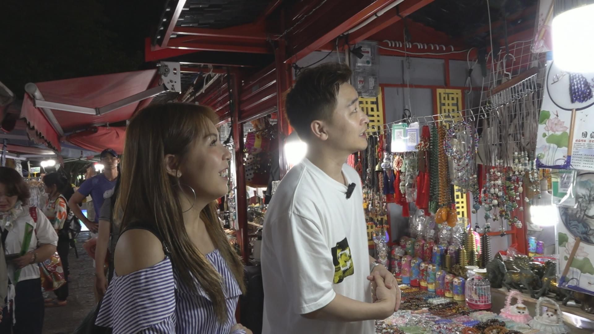 話咁快開始入夜,輝智轉到酒店同粉絲親友合照後,又大批人馬一齊去夜市買手信,輝智似乎好快就已經有收獲,仲用咗三吋不爛之舌成功講價帶走四把扇。之後佢繼續出招,又買咗兩個紀念磁貼,同埋一把檔主即場寫嘅才子扇。呢把扇仲用咗譚輝智嘅名嚟作詩,真係好有紀念價值架。