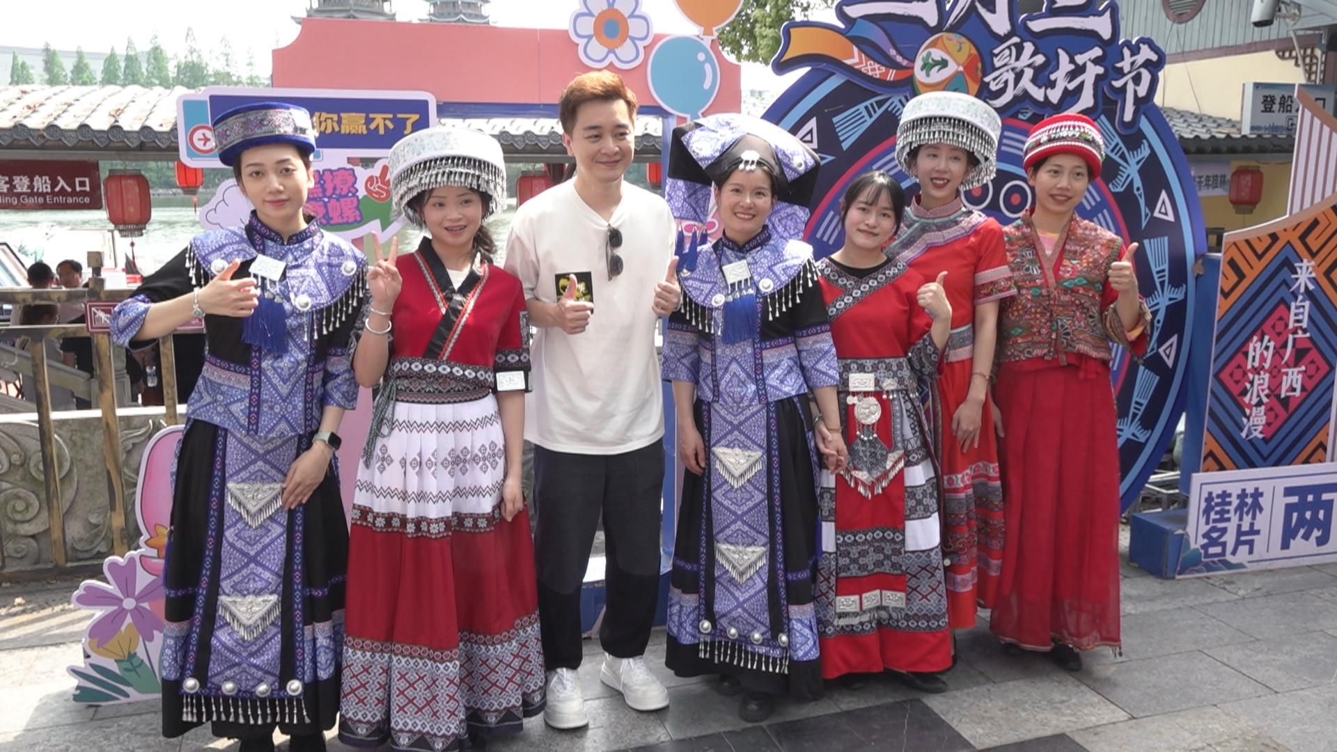 經過三小時嘅車程,輝智都有把握呢段路程好好補眠同醫肚,之後佢就帶住成班團友,浩浩盪盪到桂林熱門景點「象鼻山」,受到當地人熱情迎賓,輝智仲舞癮大發,同一班少數民族姑娘一齊跳舞,輝智仲自誇自己拿手跳民族舞。![]()