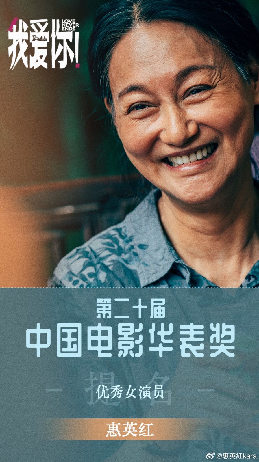 65歲嘅 惠英紅 演技一向獲大家肯定,更多度成為影后,但係紅姐依然不斷挑戰自己,喺日前內地舉行嘅第二十屆中國華表獎,紅姐再憑電影《我愛你!》獲優秀女演員獎。呢個由國家電影局主辦嘅評選嘅獎項,每兩年舉辦一次,可以話係內地其中一個最高榮譽嘅獎項。