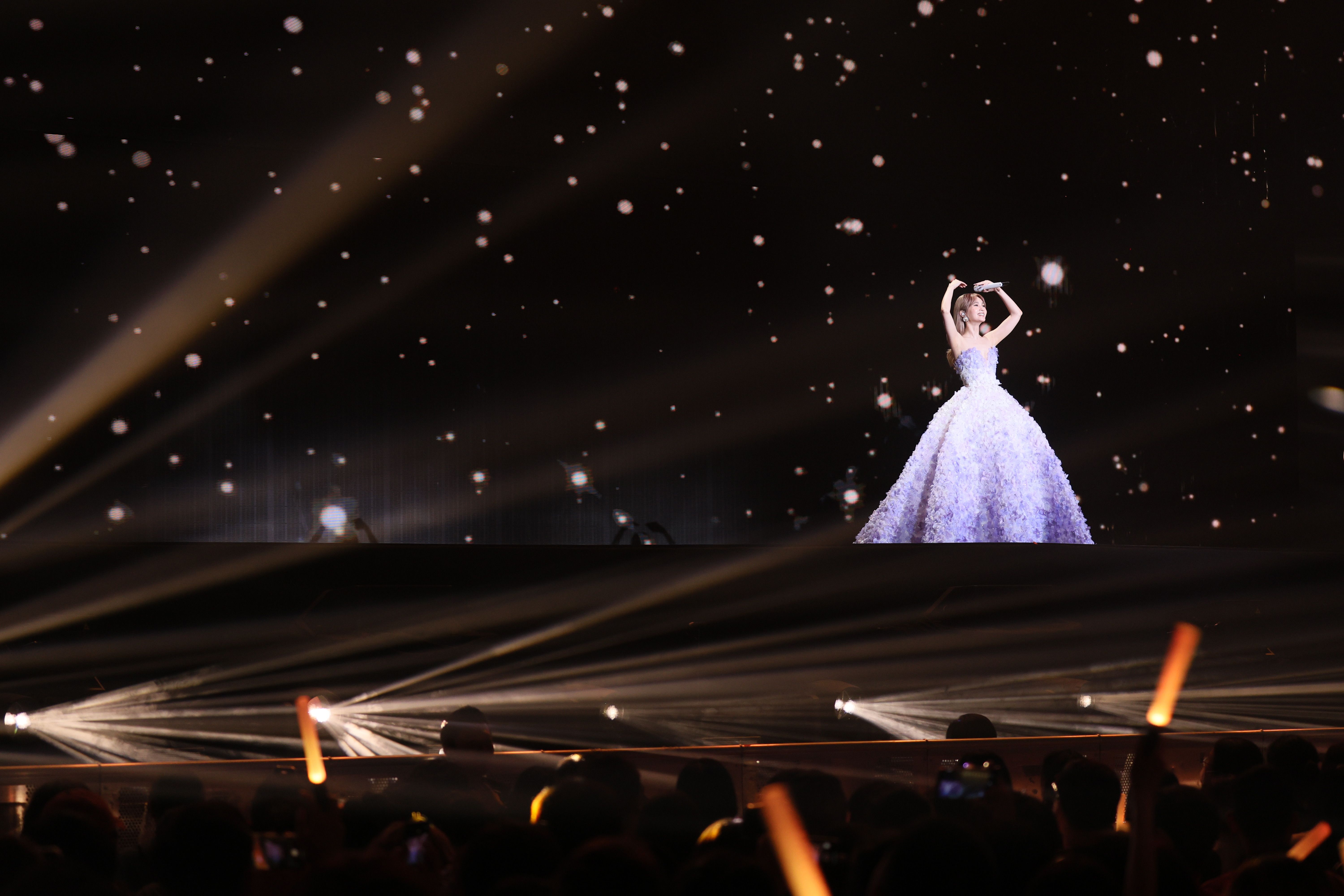 呢晚楊丞琳不時與台下樂迷互動,大派飛吻同心心,而當佢聽到有人讚佢靚時,佢就鬼馬咁話:「知道我唔似40歲,20歲呀嘛!講笑咋,隨着年紀嘅變化唱歌聲音都有改變,人生不同階段味道不一樣,今晚演唱會是彷彿重走自己青春一遍!」![]()