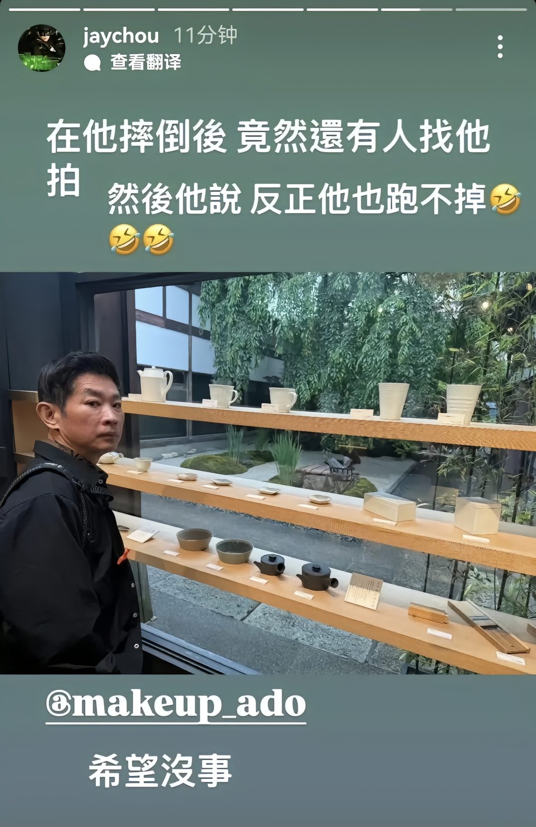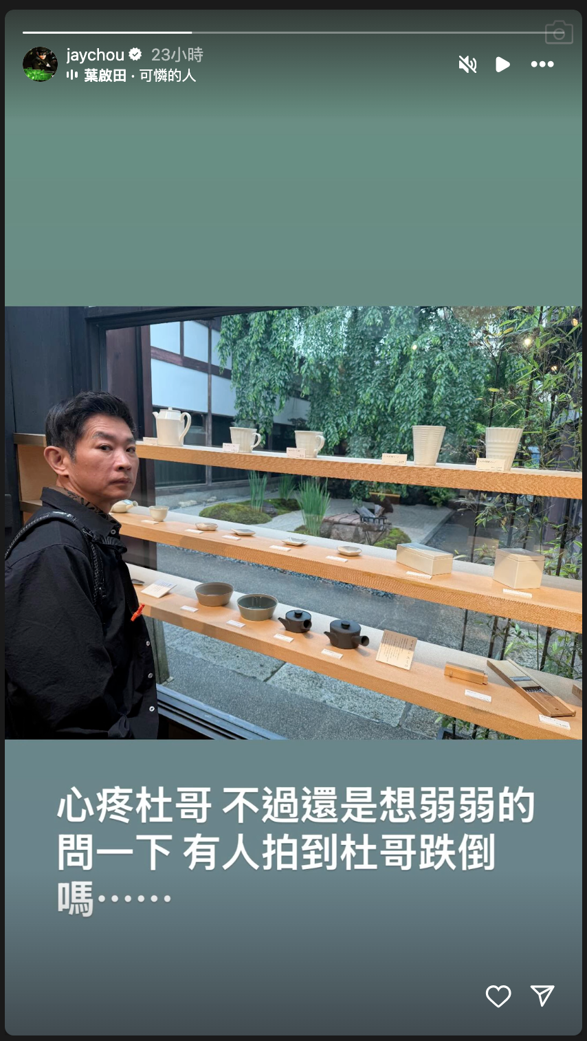 事後周董喺限動中PO出杜哥受傷前後嘅相,指杜哥有兩處地方骨折,呼籲fans唔好再跟,大家遠遠打招呼就好,周董仲喺其中一個限動中寫道:「在他摔倒後,竟然還有人找他拍,然後他說,反正他也跑不掉……希望沒事」,而最後一個限動,周董就詢問眾網民:「心疼杜哥 不過還是想弱弱的問一下 有人拍到杜哥跌倒嗎……」![]()