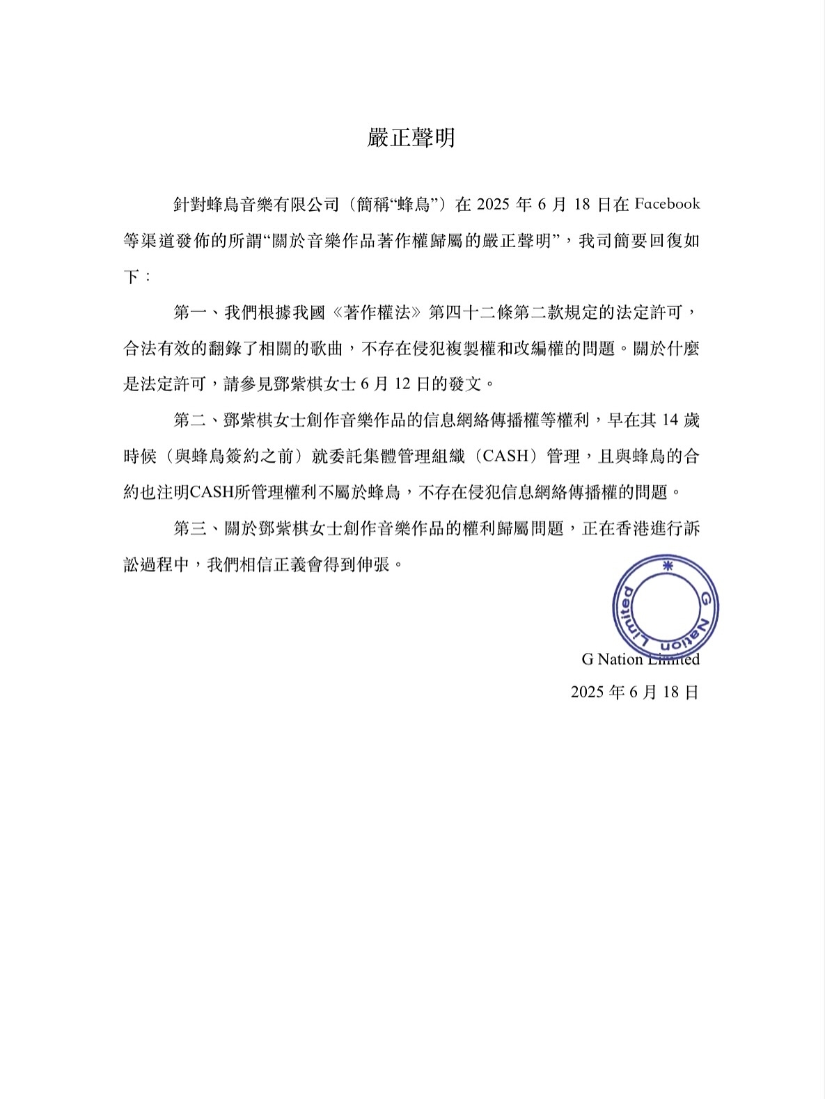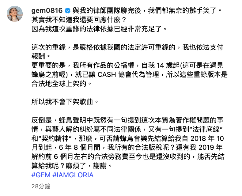 身為當事人嘅G.E.M.,同日亦發聲明回應蜂鳥音樂嘅指控,仲強調唔會將歌曲下架。G.E.M.喺帖文中寫道:「與我的律師團隊聊完後,我們都無奈的攤手笑了。其實我不知道我還要回應什麼?因為我這次重錄的法律依據已經非常充足了。這次的重錄,是嚴格依據我國的法定許可重錄的,我也依法支付報酬。更重要的是,我所有作品的公播權,自我 14 歲起(這可是在遇見蜂鳥之前喔),就已讓 CASH 協會代為管理,所以這些重錄版本是合法地全球上架的。」![]()