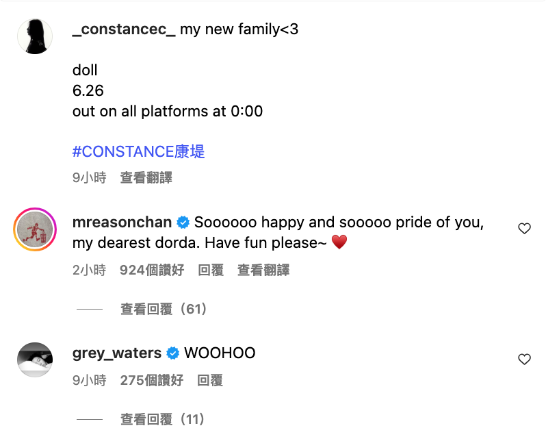 以往相當重視個人隱私嘅康堤,隨住公佈入行嘅消息後,佢嘅個人IG亦由「私人」更新為「公開」,而首個post就係新歌嘅前導影片,除咗爸爸Eason有留言:「Soooooo happy and sooooo pride of you, my dearest dorda. Have fun please~ ♥️」恭喜愛女外,好友竇靖童、曾國祥、少爺占、許恩怡、汪詩詩等都有留言祝賀。![]()