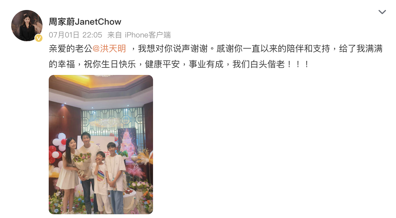 雖然有人認為家蔚嘅旅遊片係同天明一齊夾埋扮恩愛,但兩公婆繼續懶理閒言,家蔚喺7月1號、亦即係天明生日當晚,就喺社交平台發深情祝福,表示:「親愛的老公@洪天明,我想對你說聲謝謝。感謝你一直以來的陪伴和支持,給了我滿滿的幸福,祝你生日快樂,健康平安,事業有成,我們白頭偕老!!! 」力證夫妻情依然甜蜜恩愛,更附上一家四口幸福又溫馨嘅合照,作為壽星嘅天明更捧住一紮鮮花,相信應該係老婆嘅心意喇!![]()