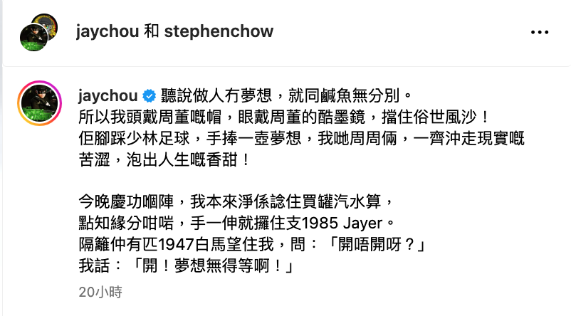 相中所見,雙周雙雙戴上黑超、腳踏白色波鞋,周董更踩住一個足球,而帖文中佢哋就寫道:「聽說做人冇夢想,就同鹹魚無分別。所以我頭戴周董嘅帽,眼戴周董的酷墨鏡,擋住俗世風沙!佢腳踩少林足球,手捧一壺夢想,我哋周周倆,一齊沖走現實嘅苦澀,泡出人生嘅香甜!今晚慶功嗰陣,我本來淨係諗住買罐汽水算,點知緣分咁啱,手一伸就攞住支1985 Jayer。隔籬仲有匹1947白馬望住我,問:『開唔開呀?』我話:『開!夢想無得等啊!』」![]()