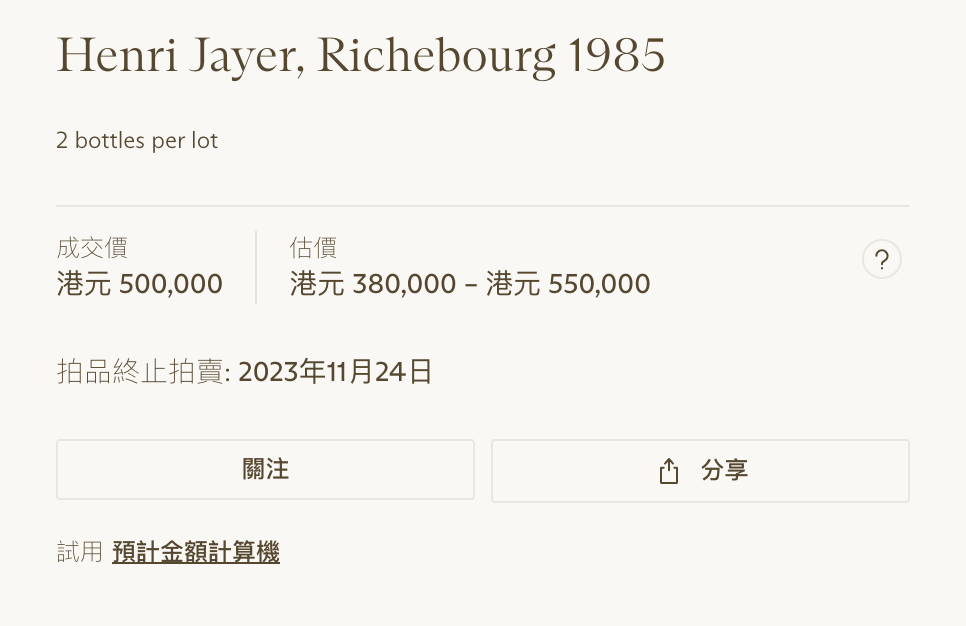 佢哋喺文中提到嘅 「1985 Jayer」同「1947白馬」其實係紅酒,據資料顯示,白馬堡 1947 (CHÂTEAU CHEVAL BLANC 1947) 估值$304,375美金一支,而 Henri Jayer, Richebourg 1985 ,喺2023年嘅拍賣成交價就要港幣500,000, 雙周嘅夢想果然價值不菲!![]()