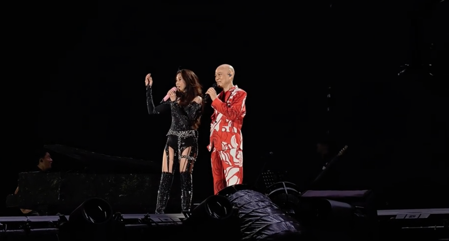 着住紅色印花西裝嘅家英哥,獻唱佢喺電影《西遊記大結局之仙履奇緣》入面唱嘅《Only You》,一開口就令全場歌迷興奮尖叫,家英哥邊唱邊做動作配合歌詞,而Karen則在旁為其和音。![]()