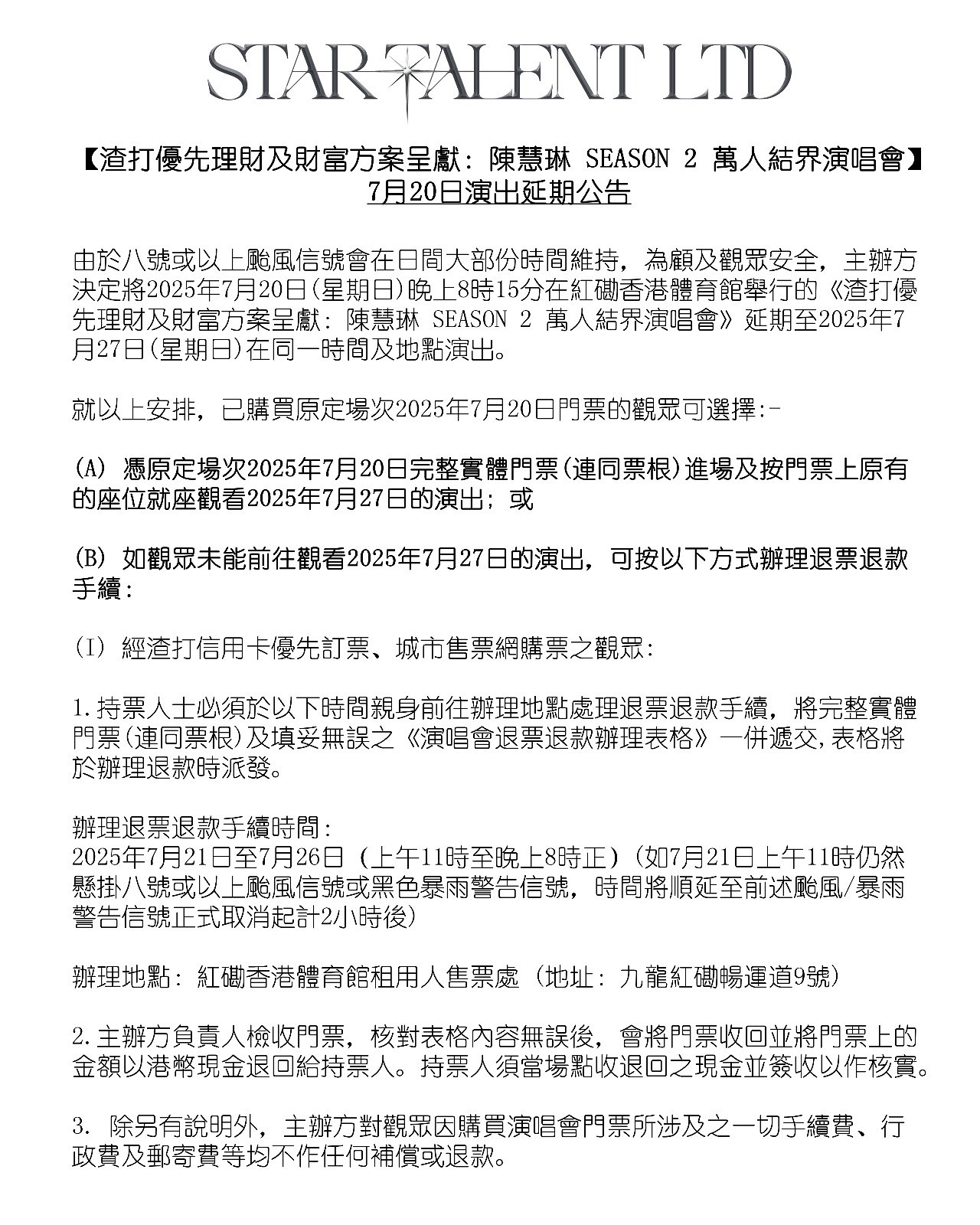 此外,受颱風韋帕影響,為顧及觀眾安全,主辦方將7月20日嘅演出,延期至7月27日,同一時間、地點舉行,已購買7月20日門票嘅觀眾可選擇以當日完整實體門票(連同票根)進場及按門票上原有座位就座觀看7月27日演出, 或選擇相關退票安排,有關細節請瀏覽主辦方Star Talent Limited社交平台公告。![]()