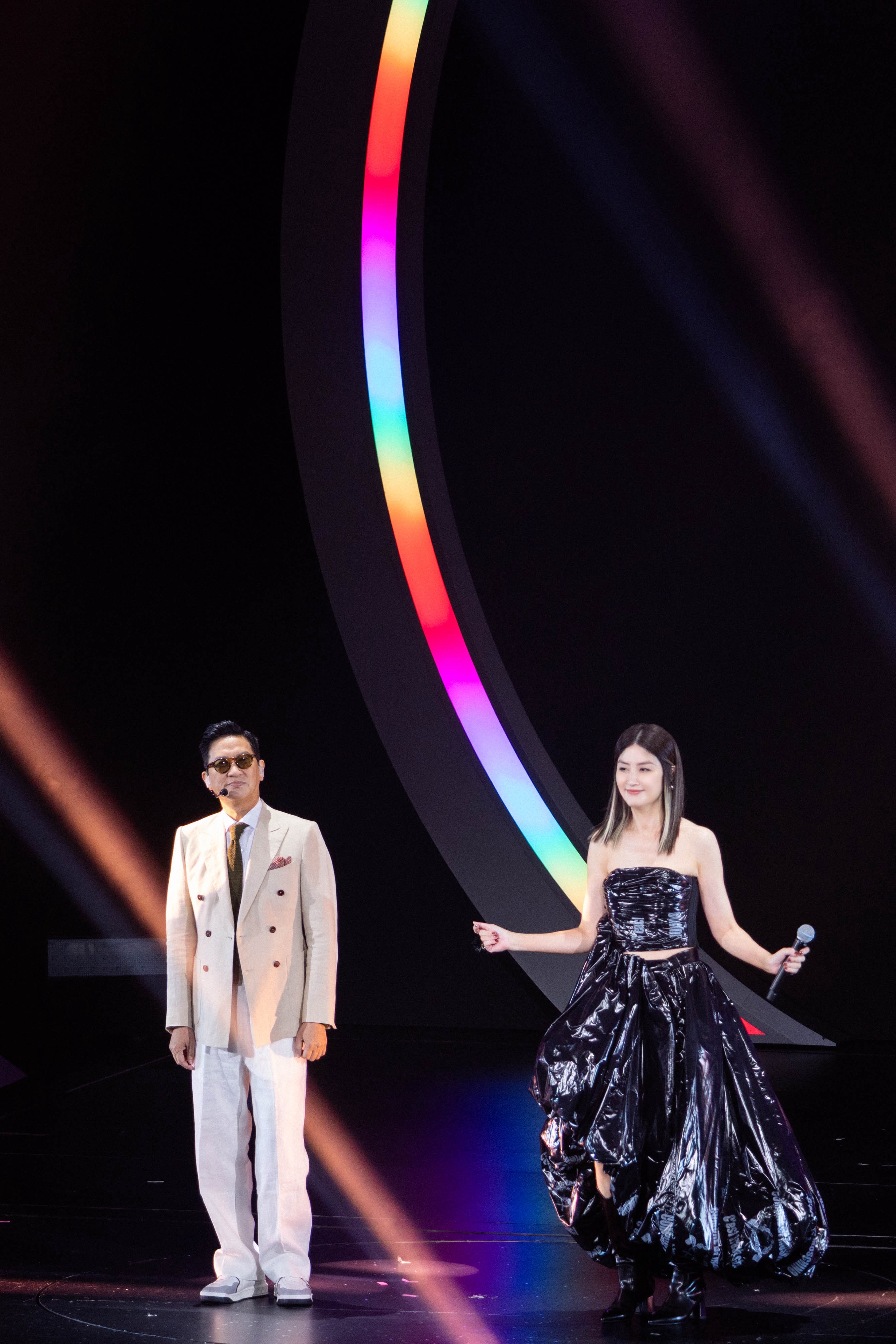 Kelly上次為家輝宣傳電影《贖夢》時,以一身垃圾黑膠袋「垃圾婆」造型現身戲院力挺對方。所以呢次輪到Kelly主場,佢都特別換返一襲黑色訂制「垃圾膠袋」晚裝隆重歡迎家輝。家輝笑稱:「十年前演唱會我喺到,十年後我又係到,希望十年再十年你演唱會,我都可以參與下,到時候可以拉二胡、彈琵琶助興。」![]()