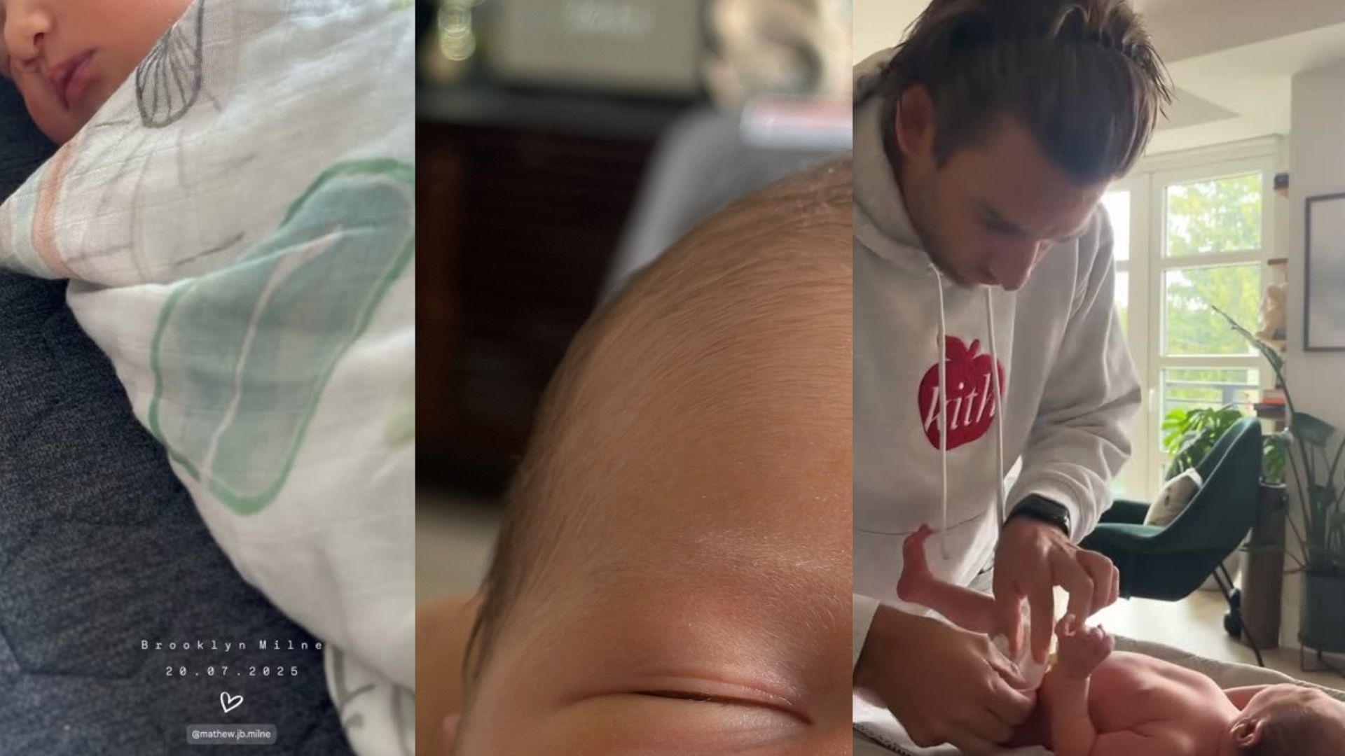 婷婷未有分享阿仔Brooklyn Milne嘅正面相,每張相都係半塊面,B仔頭髮濃密、面仔脹卜卜,熟睡個樣亦非常可愛,而Mathew亦細心照顧阿仔,可見婷婷一家四口,十分幸福。