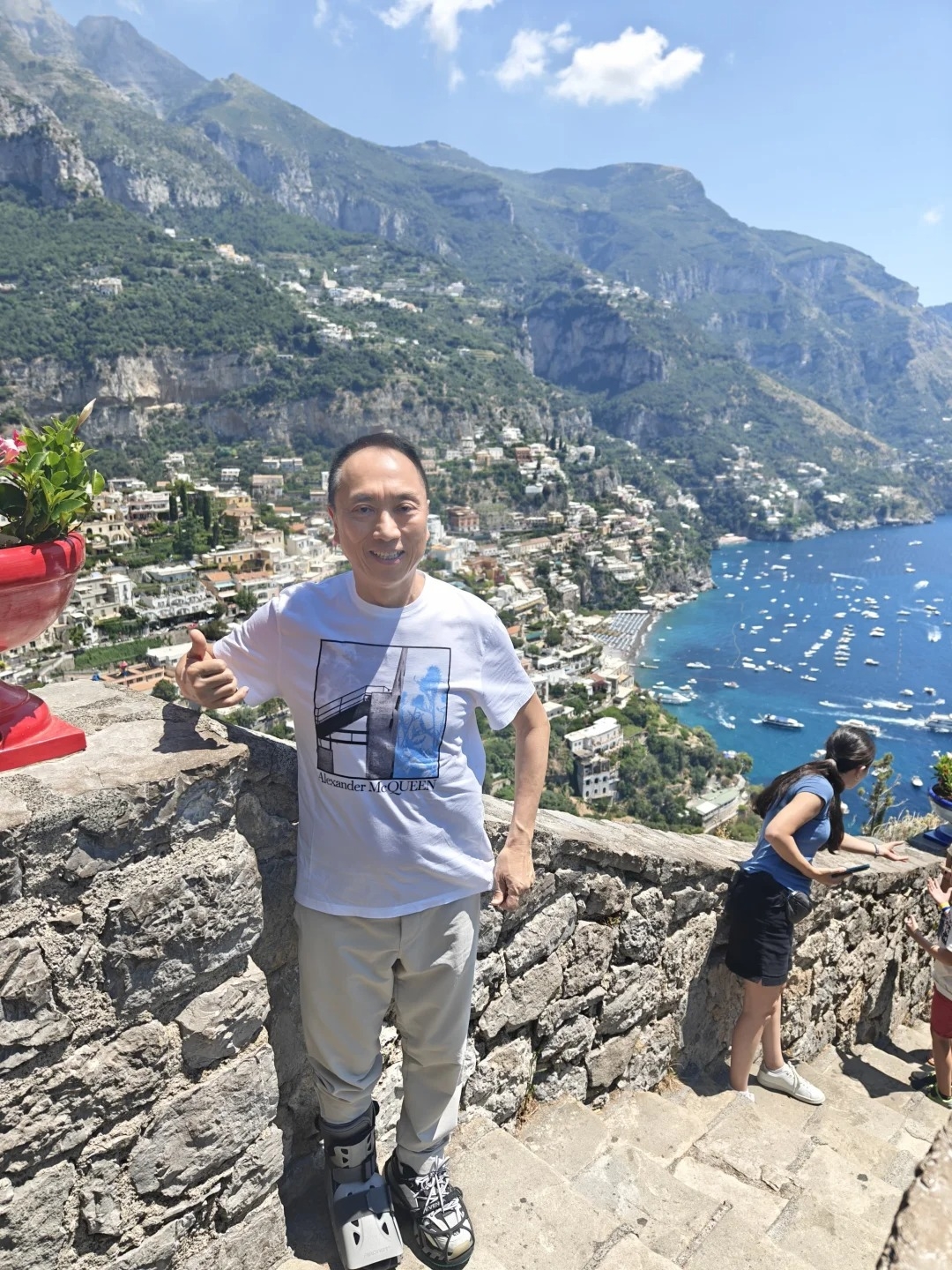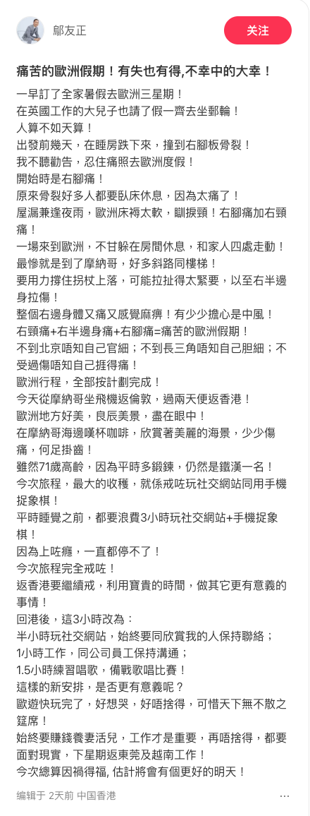 不過鄔友正呢次歐遊有唔少阻礙,先係佢出發前就已經受傷,之後太太 翁嘉穗 喺倫敦去羅馬嗰程,就一度唔見咗電話,當電話搵返後,又到行李被遺留咗喺倫敦。而忍痛用拐杖堅持同家人去唔同景點嘅鄔友正,就因為歐洲床褥太軟而搞到瞓捩頸!一度擔心自己係中風嘅鄔友正,喺社交平台發文表示:「原來骨裂好多人都要臥床休息,因為太痛了!屋漏兼逢夜雨,歐洲床褥太軟,瞓捩頸!右腳痛加右頸痛!一場來到歐洲,不甘躲在房間休息,和家人四處走動!最慘就是到了摩納哥,好多斜路同樓梯!要用力撐住拐杖上落,可能拉扯得太緊要,以至右半邊身拉傷!整個右邊身體又痛又感覺麻痹!有少少擔心是中風!右頸痛+右半邊身痛+右腳痛=痛苦的歐洲假期!」![]()