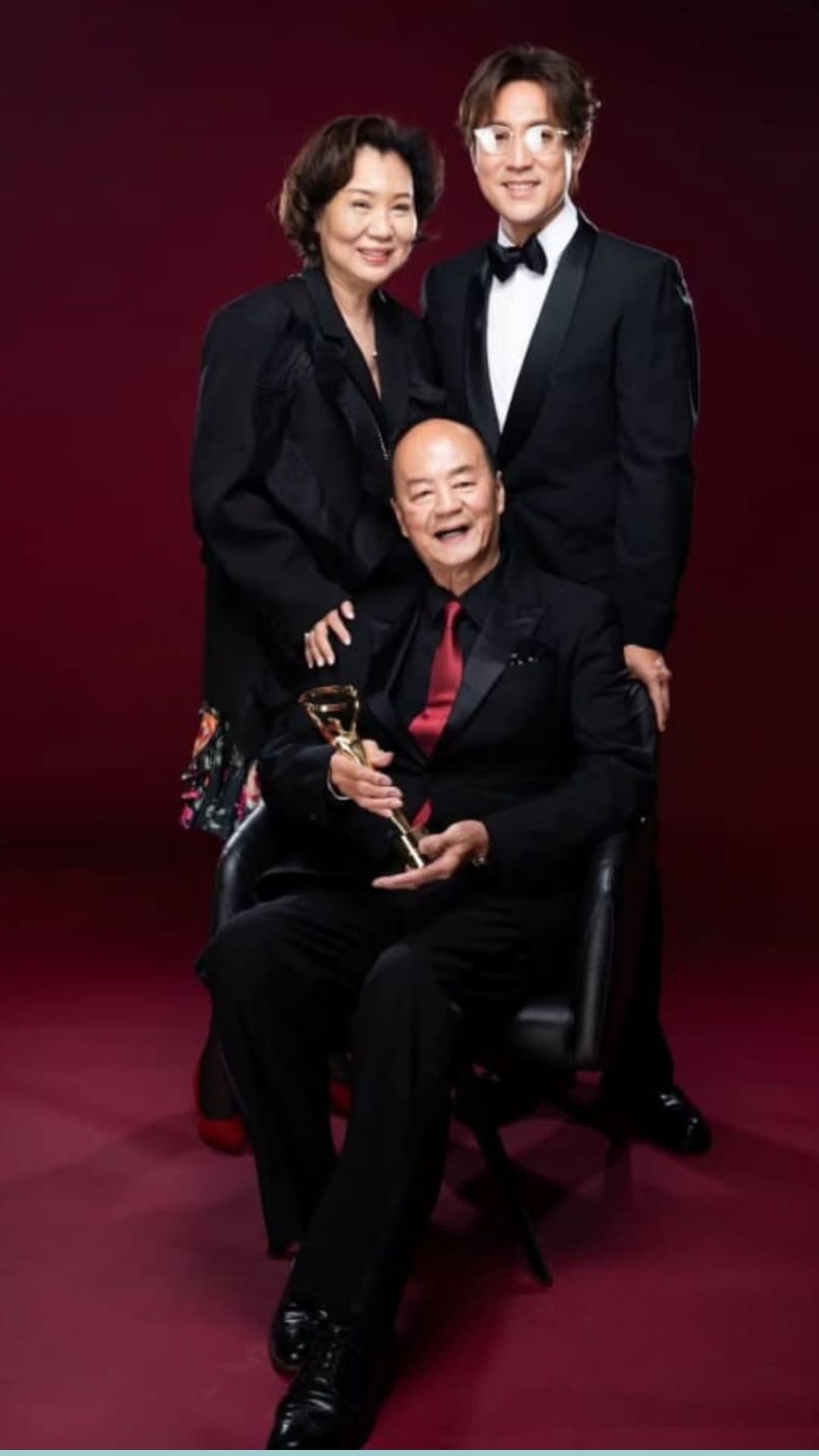 其實呢張相極具紀念價值,因為係狄龍日前喺馬來西亞獲頒終身成就獎後,爸爸捧住獎項嘅全家福。相中狄龍精神飽滿,展現幸福愉快嘅笑容,當晚狄龍大哥更以流利英語致辭,Shaun則暪住爸爸驚喜上台獻花,父子擁抱場面感人。![]()