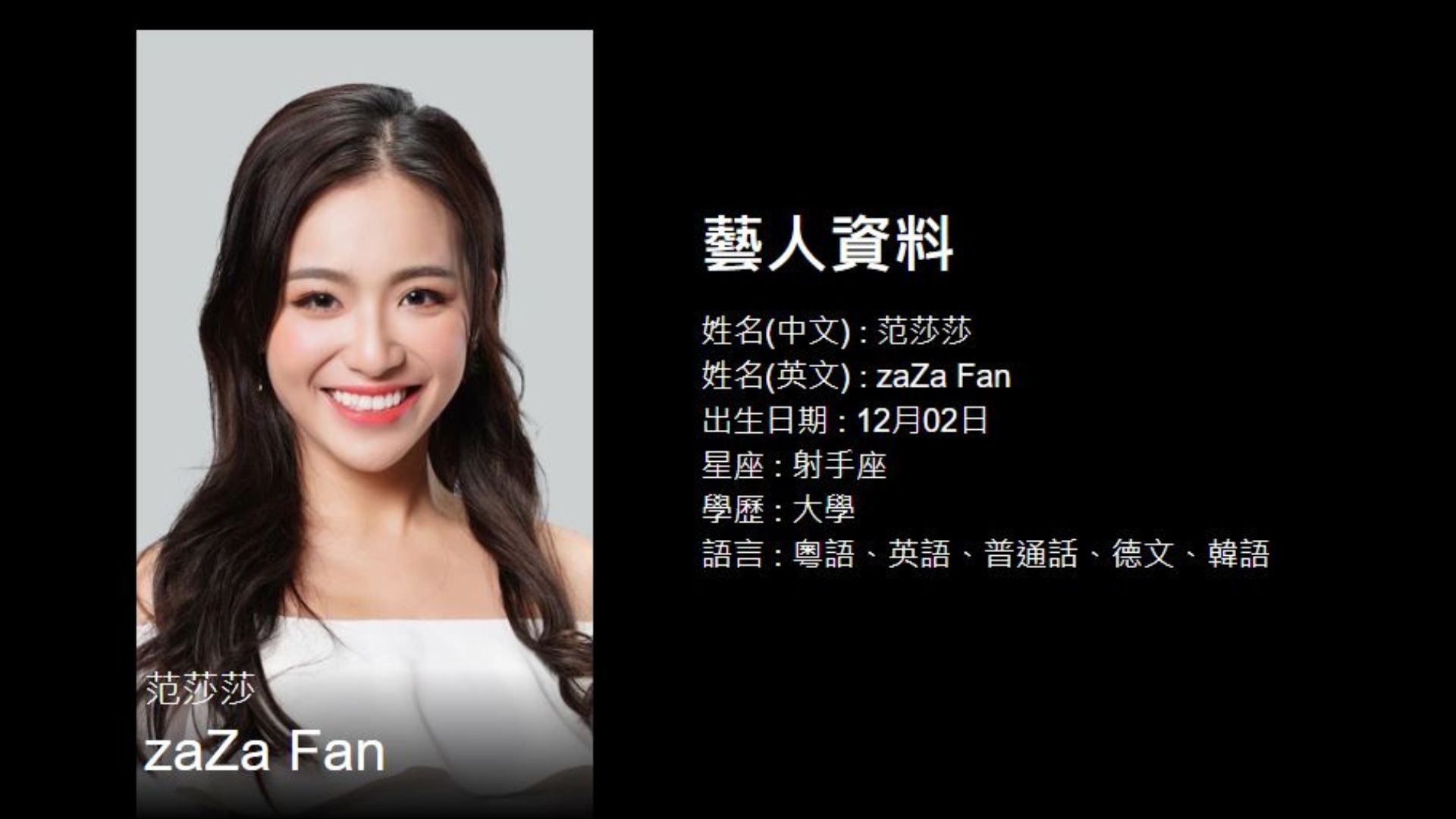 曾參選2018年港姐嘅范莎莎,先後參與J2真人騷《CP訓練營》及主持《美食新聞報道》,最近出演《愛·回家之開心速遞》,佢亦不時喺IG派福利。