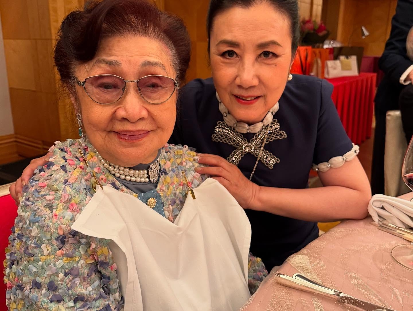 身穿深藍色長裙嘅Liza姐氣質高貴,心口嘅蝴蝶結裝飾亦好搶眼,佢同多位友人都有合照留念。從Liza姐同汪曼玲分享可見,已經年屆97歲嘅仙姐打扮得雍容華貴,非常精靈,氣息同精神狀態都同4月慶祝生日時無異。![]()
