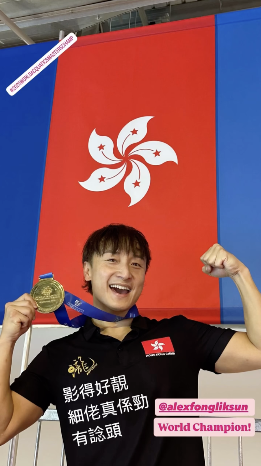 恭喜恭喜,準爸爸 方力申 星期五喺新加坡舉行嘅2025世界先進游泳錦標賽中,以2分16秒勇奪男子200米背泳嘅45-49歲組別冠軍。摘冠攞金牌一刻小方心情興奮,細佬更同行為佢紀錄精彩每分每秒,小方心情平伏後陸續出Post感謝支持佢嘅人,更特別表揚細佬為佢拍下一張,喺特區區旗前攞住金牌嘅開心時刻。而唔少圈中好友好似張繼聰、劉浩龍、關楚耀等都有出Po賀小方奪冠。
