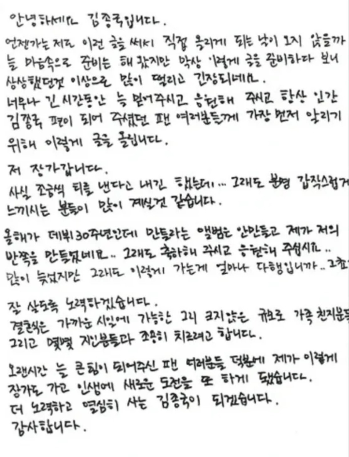 金鐘國喺信中寫到:「雖然內心一直準備著,總有一天我也會親自寫下這樣的文章上傳,但真的要動筆,比想像中更激動和悸動」。佢感激話:「我希望最先告訴長久以來相信我、支持我,總是站在金鍾國這一邊的粉絲們,因此上傳這篇文。」![]()