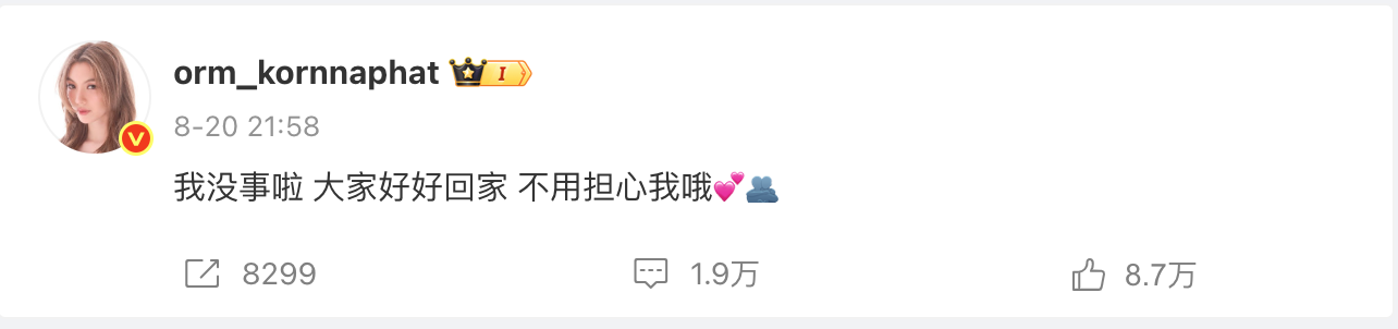 雖然被無禮對待,但Orm對住fans仍強撐笑容,更為自己失態落淚而向在場fans合十道歉,而活動後Orm更於微博安撫fans:「我没事啦 大家好好回家 不用担心我哦💕🫂 」。見到偶像受委屈,fans們事後紛紛將事件曝光到網上,要求主辦作出交代。![]()