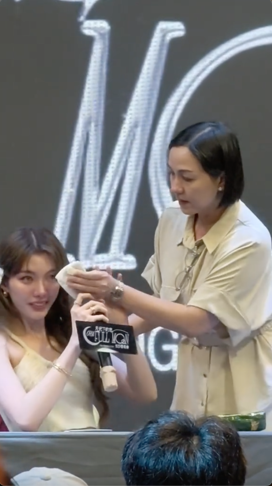由於語言不通,令無助嘅Orm忍唔住當場落淚,而同行嘅Orm媽亦嬲到雙眼通紅,主辦單位見狀即叫保安上台阻擋fans影相拍片。![]()