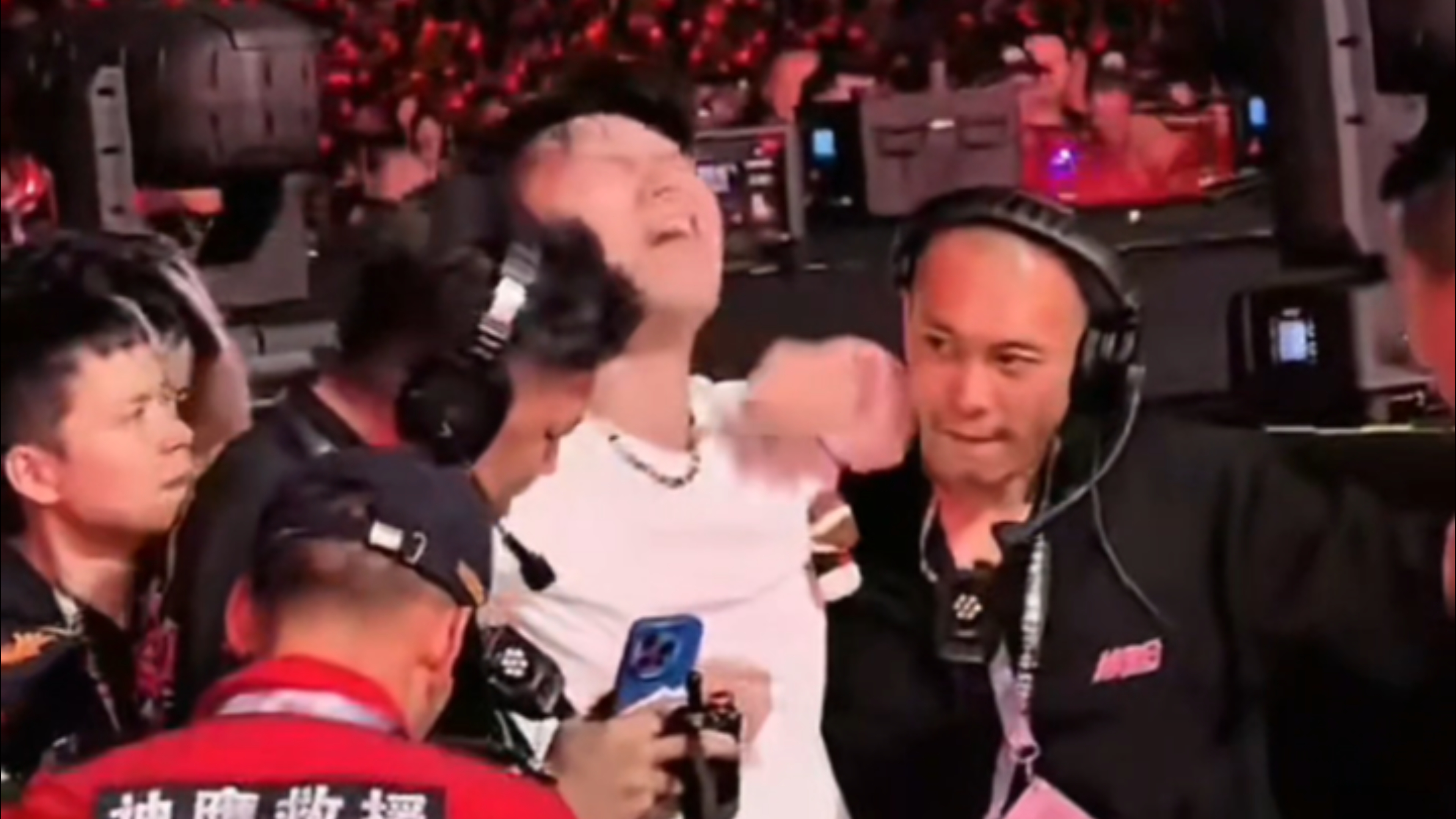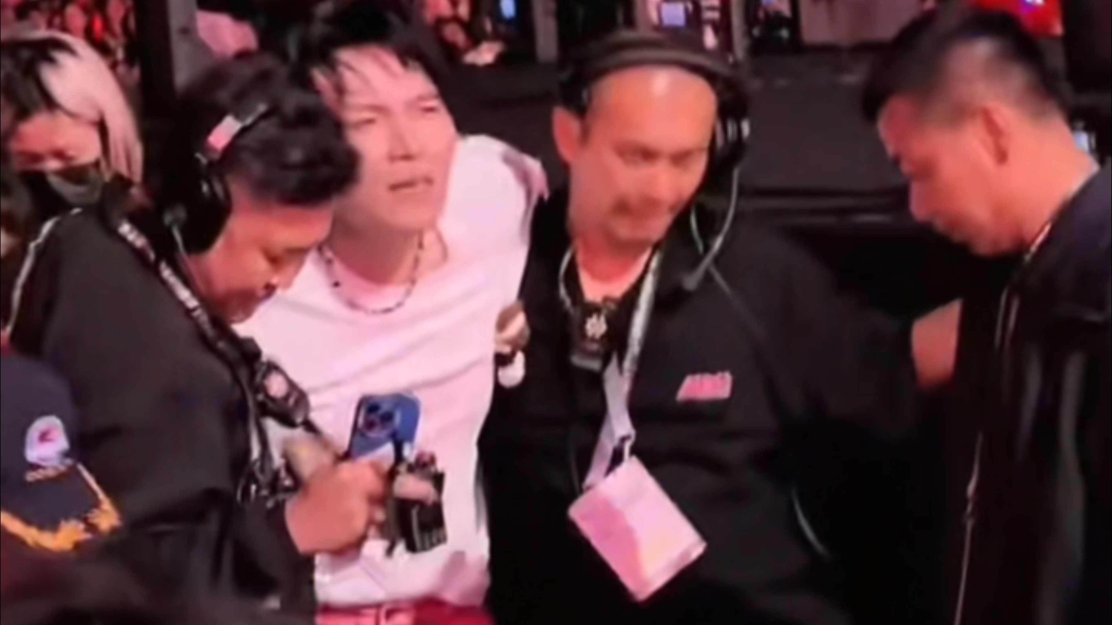 現場隨即傳出巨大撞擊聲,麥克風撞擊地面,工作人員隨即峰擁而至了解傷勢,現場畫面可見佢露出痛苦表情,之後被攙扶下返回後台。![]()