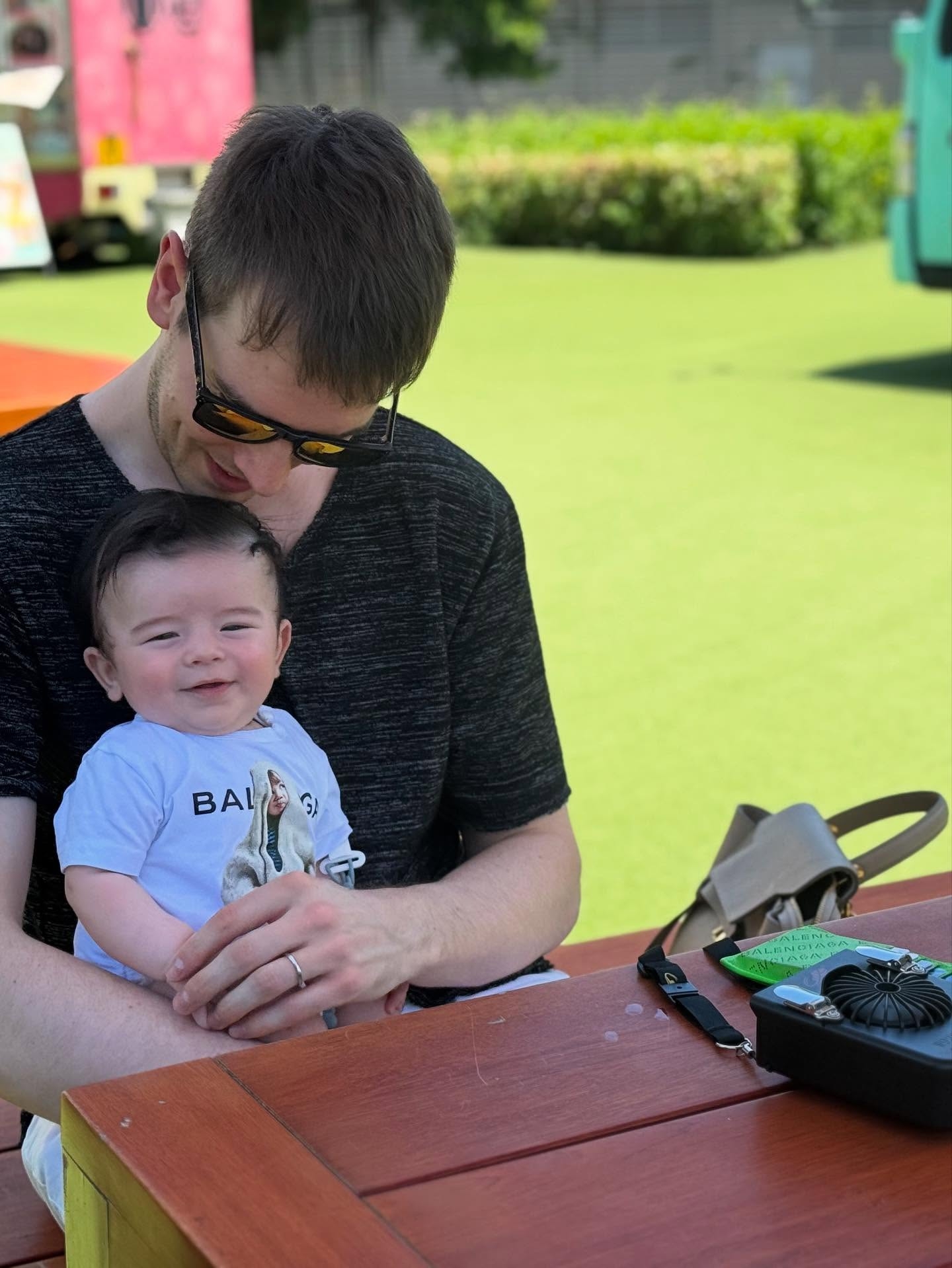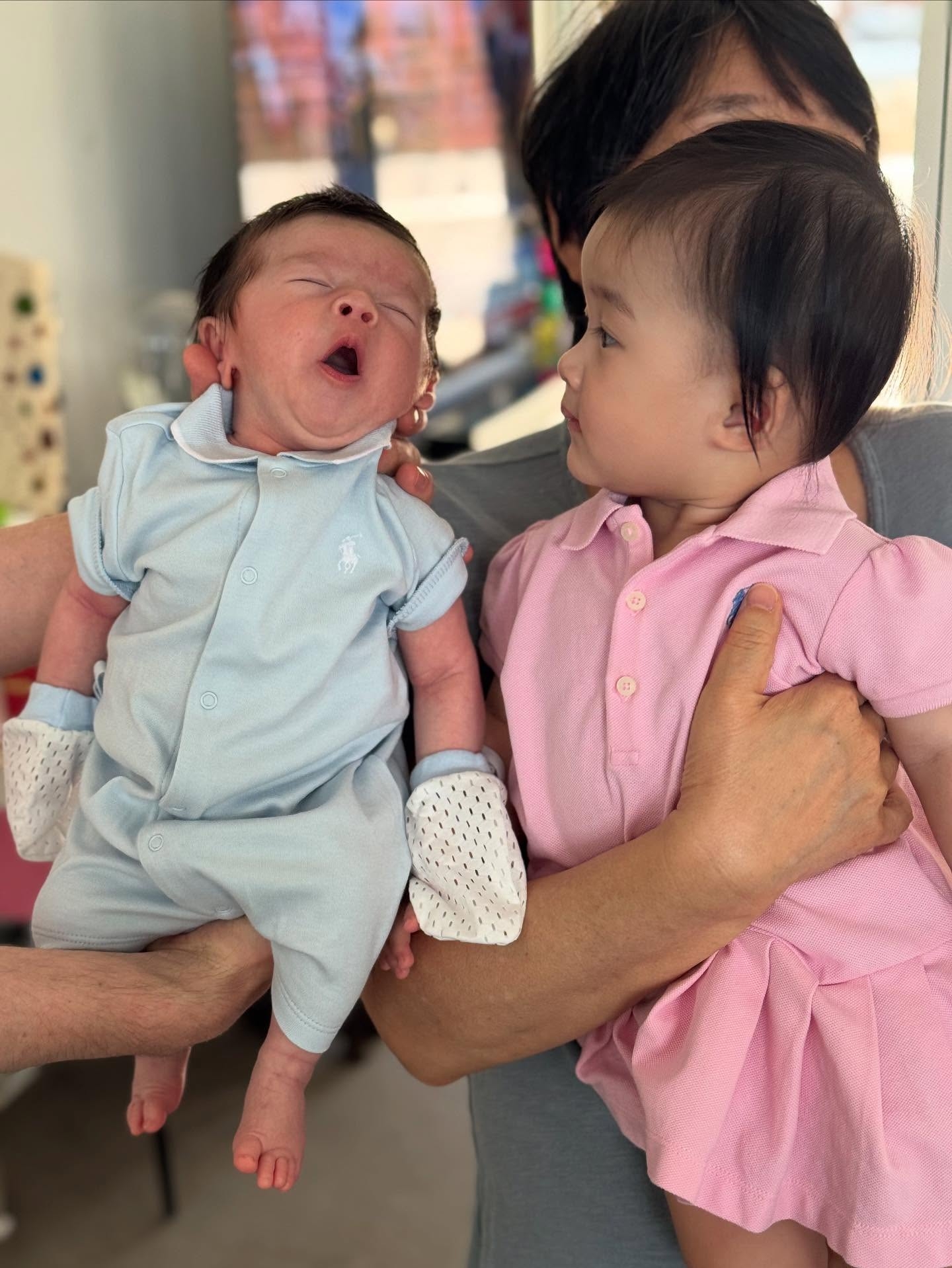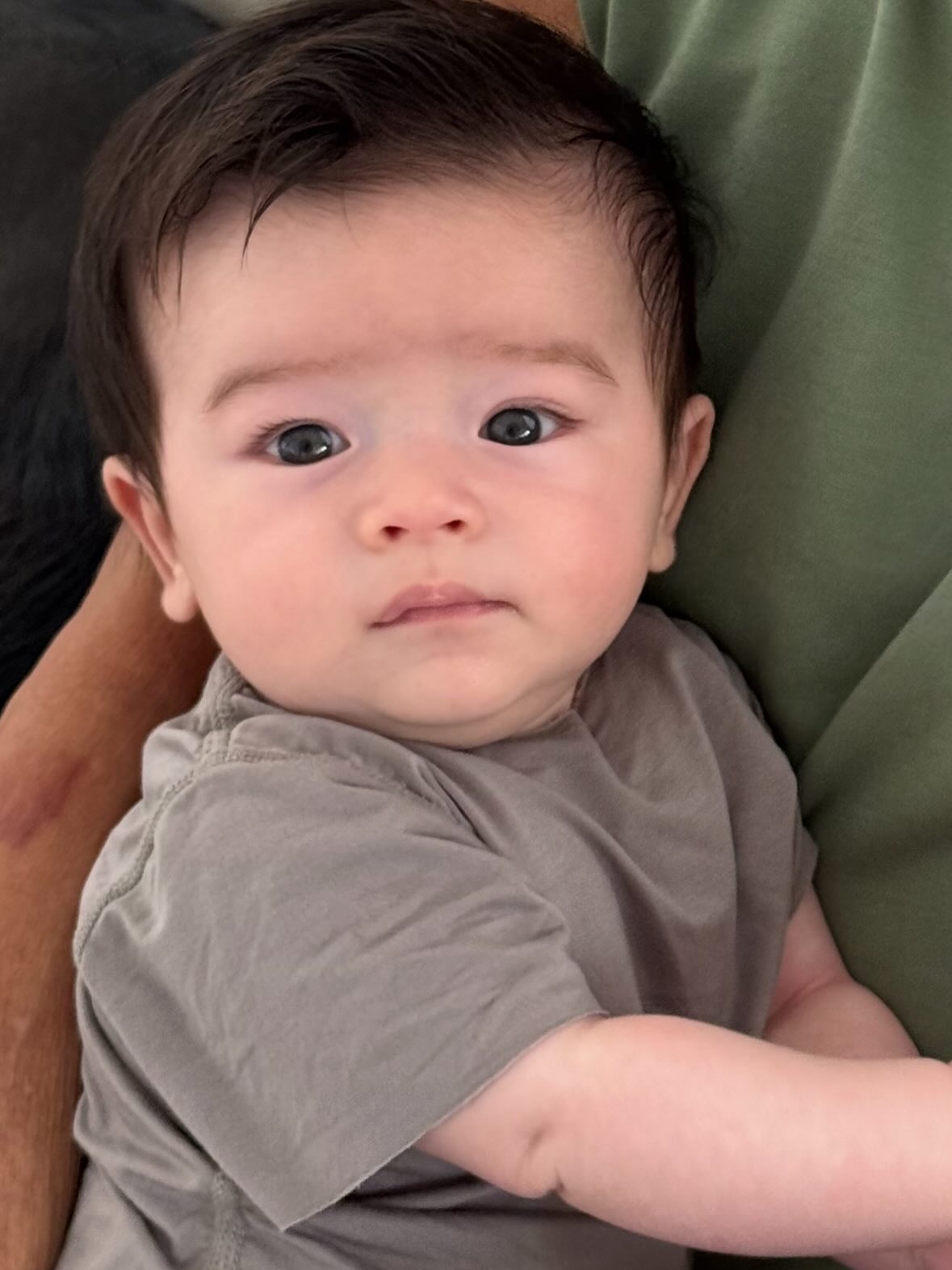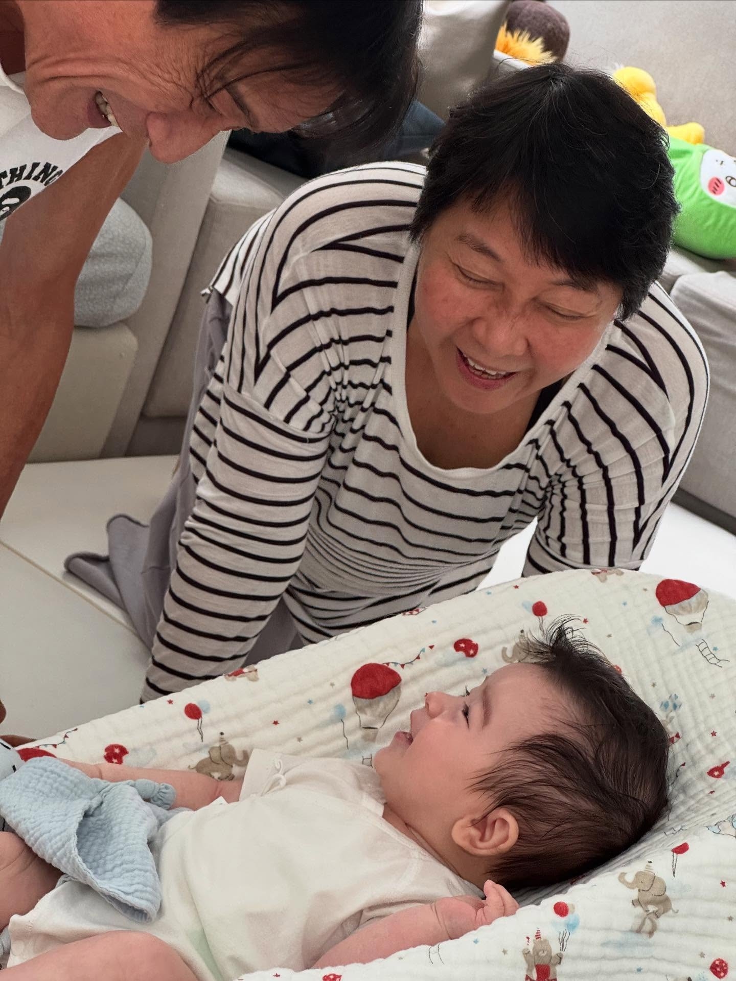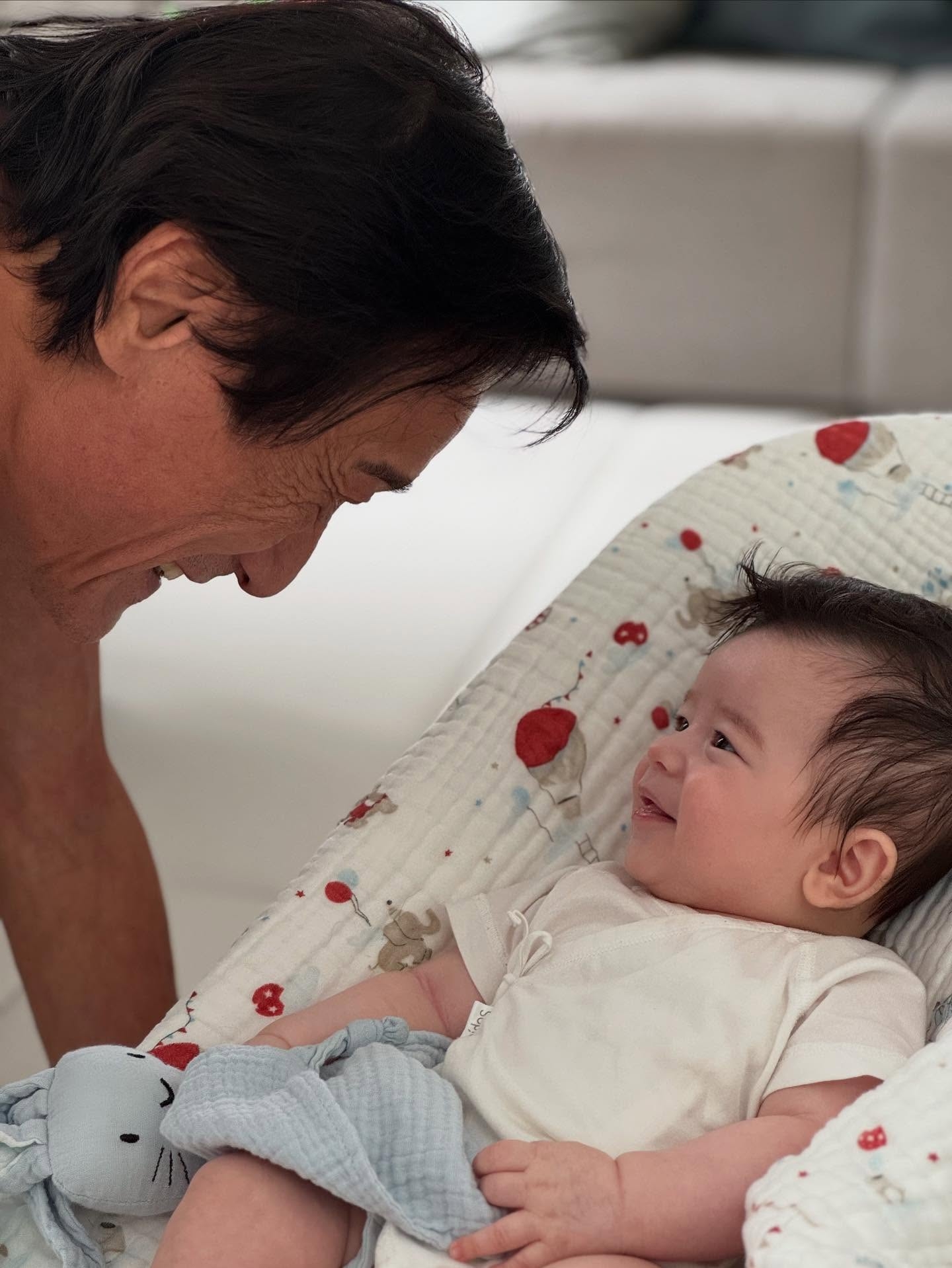 Nikkie喺社交平台曬出公孫嘅合照,見梁家輝外孫Thibeaux四個月大,已經勁靚仔,仲十分精靈可愛,梁家輝撩個孫仔玩嗰陣,仲笑到見牙唔見眼。兩公孫深情對望嗰陣,真係整個心都被融化!