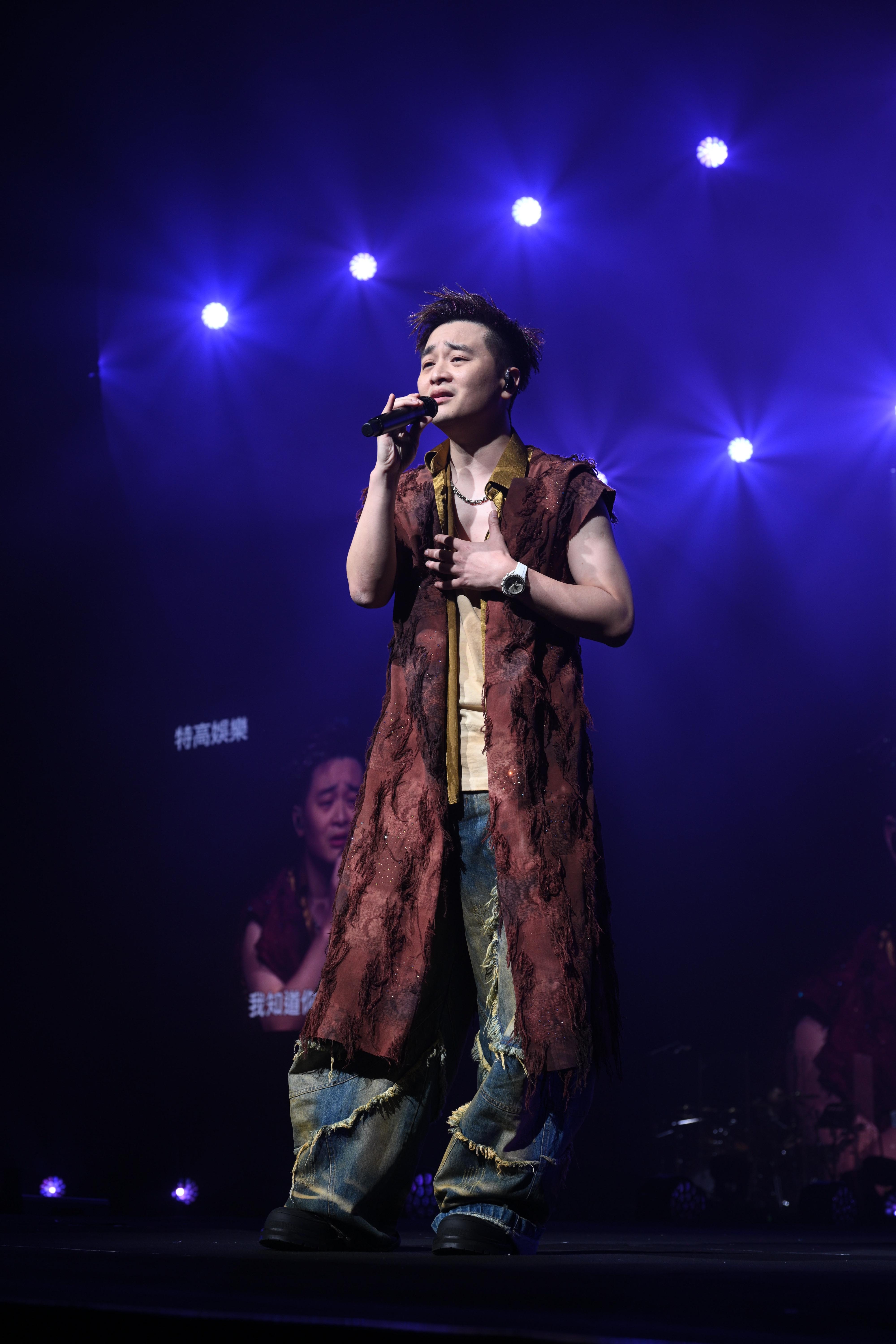 「土星」譚輝智除咗獻唱慢歌外,當然唔少得晒一晒「譚式舞技」,原來演唱會當日係輝智嘅囝囝生日,由於未能陪對方慶祝,所以輝智喺台上搞笑咁話:「以前仔仔生日我一定陪佢過,今年唔好意思,要仔仔陪我喺度過。我知道你一定好難過,我就送上一首《我知道你很難過》比你。」![]()