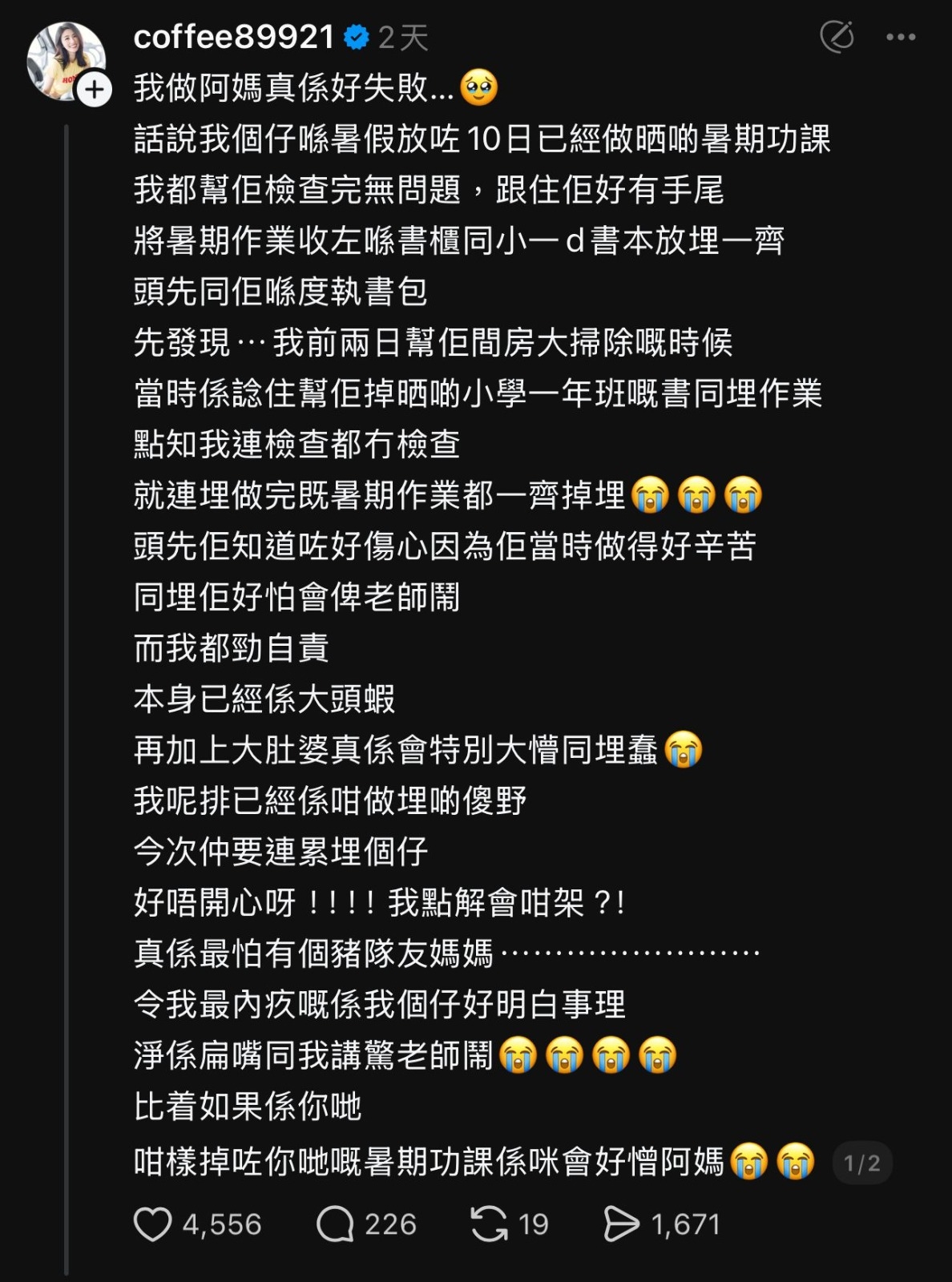 Coffee早前幫阿仔執房時,唔小心將阿仔本暑期作業連同小一嘅舊書一齊掉咗,Coffee頓時感到崩潰,阿仔既傷心又好擔心被老師鬧,Coffee相當自責,仲自嘲係大懵同蠢嘅豬隊友媽媽,Coffee話最初得悉呢件烏龍事一刻,曾經諗過逃避,唔想話畀阿仔知。