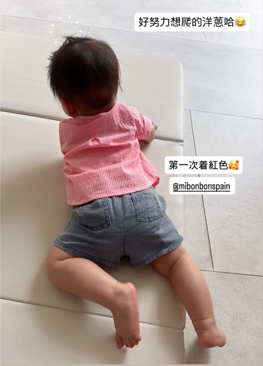 話咁快哈哈已經接近半歲,呢個階段開始牙牙學語,又會試圖爬行,媽媽翠如就忙住捕捉到BB珍貴一刻,並上載到限時動態上同大家分享。相中所見,滿身肉肉嘅哈哈趴喺地墊上,媽媽喺相中寫道:「好努力想爬行的洋蔥哈,第一次着紅色。」另一張相就應該係哈哈幾經努力學有所成咁坐喺地上,翠如指「喺爸B飛之前我好似學識咗。」明示哈哈成功學爬行,畫面對父母嚟講確係無比珍貴。![]()