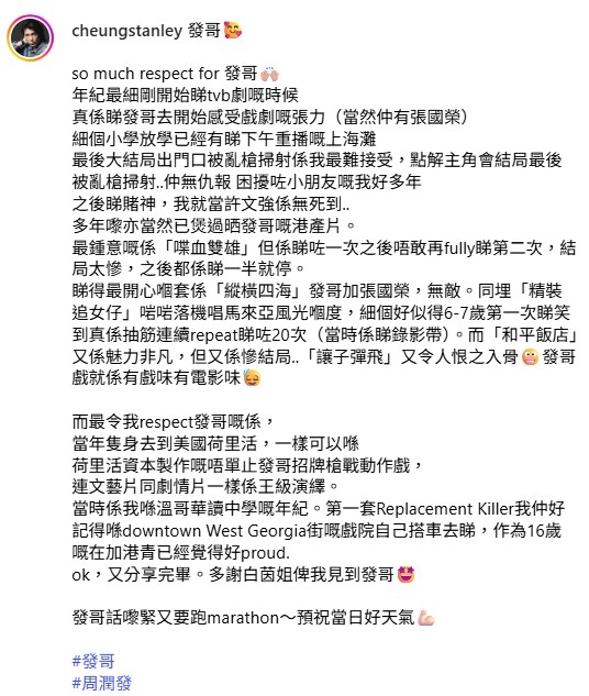 事關當日在場嘅景淳,有把握機會「自肥」,同發哥影張招牌selfie,仲喺IG寫下長文細數對發哥嘅喜愛同尊敬,「細個小學放學已經有睇下午重播嘅《上海灘》,最後大結局出門口被亂槍掃射係我最難接受,點解主角會結局最後被亂槍掃射,仲無仇報,困擾咗小朋友嘅我好多年」。
