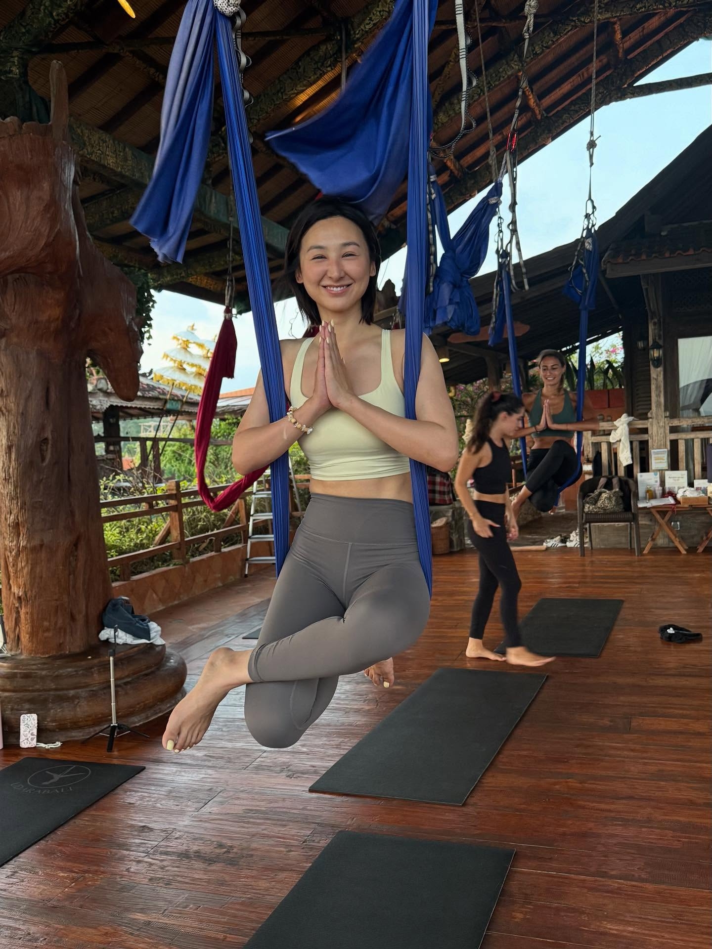 高Ling近年愛上瑜伽運動,練成火辣辣身材,相中見佢穿運動bra top及瑜伽褲,盡騷完美曲線,認真上空中瑜伽課,身材玲瓏有致,而佢腹部兩側線條結實零贅肉,非常吸晴!喺高Ling多張「男友視角」嘅靚相當中,見到一張佢同顏卓靈嘅合照,原來二人呢次係相約峇里閨密遊。