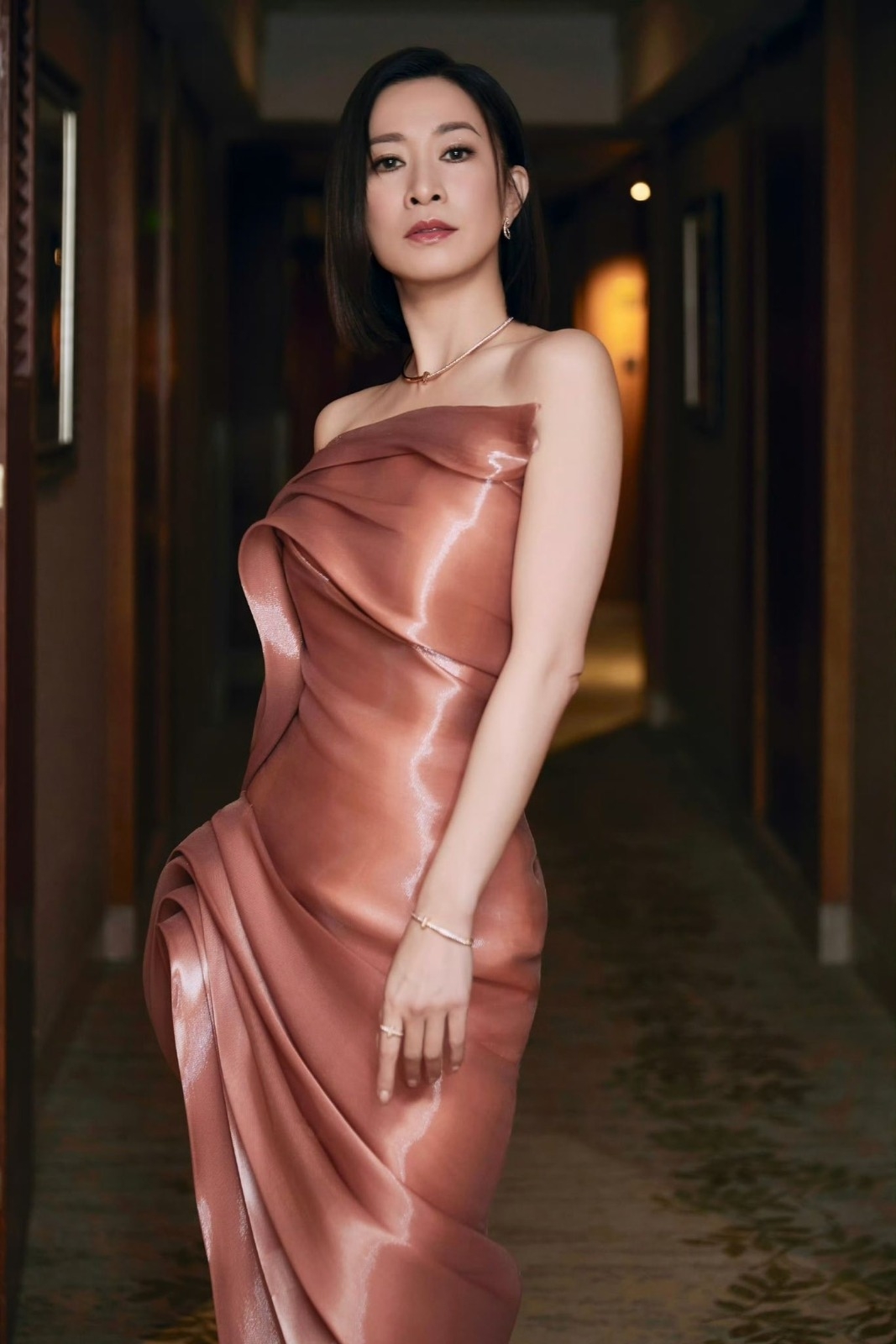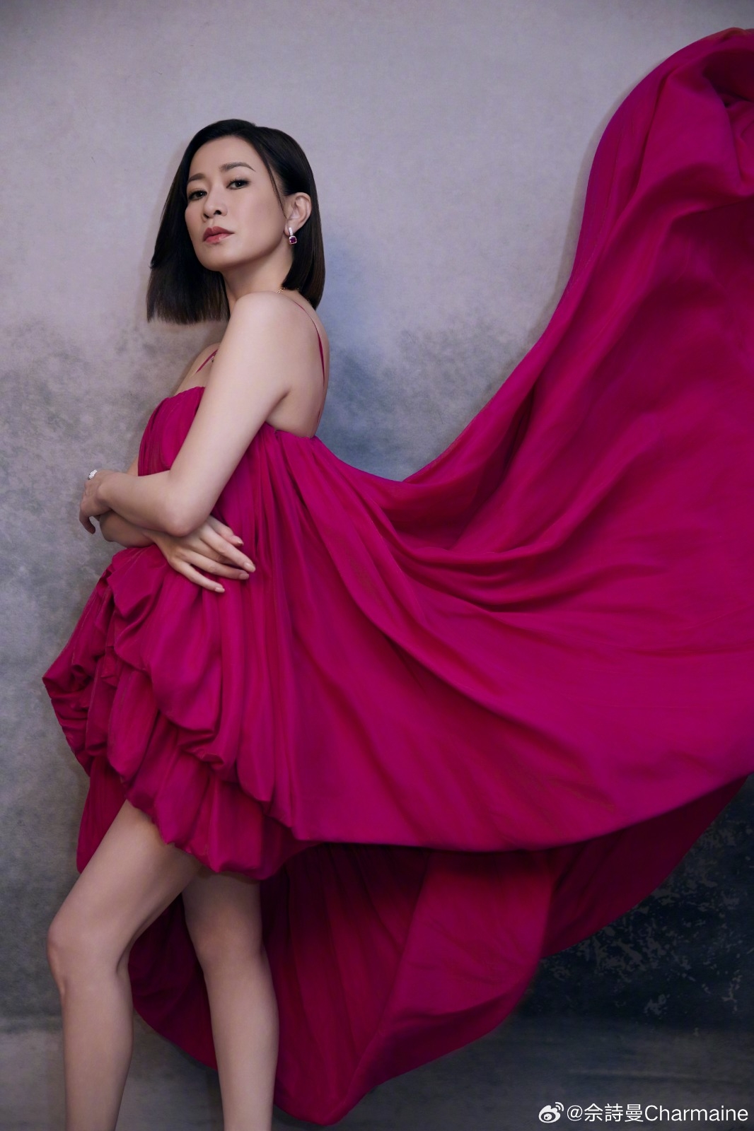 阿佘盛裝赴會,先以飄逸鮮色靚裙同內地實力演員張頌文踏上紅地氈,跟住再以金屬色露肩晚裝參加頒獎禮。 ![]()
