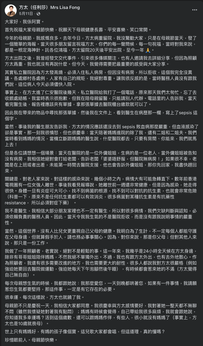 翻看阿寶之前嘅帖文,原來喺母親節時,阿寶曾經發長文指方太去年曾病重留院,當時方太喺醫院留院20日,阿寶指雖然去年都有唔少媒體詢問方太嘅身體狀況,但由於當時要專心照顧方太,所以未有細說,直到而家方太已經完全康復,阿寶先決定分享自己嘅感受。![]()