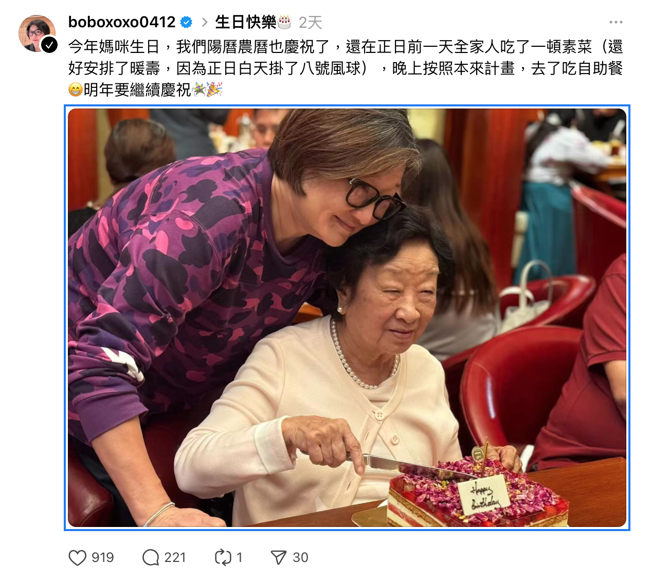 阿寶日前就PO出為方太慶祝91歲生日嘅照片,相中戴上珍珠頸鏈同耳環嘅方太,對住鏡頭微笑切蛋糕,而阿寶就企喺媽媽背後一齊合照,阿寶喺帖文中寫道:「今年媽咪生日,我們陽曆農曆也慶祝了,還在正日前一天全家人吃了一頓素菜(還好安排了暖壽,因為正日白天掛了八號風球),晚上按照本來計畫,去了吃自助餐😁明年要繼續慶祝🪅🎉」![]()