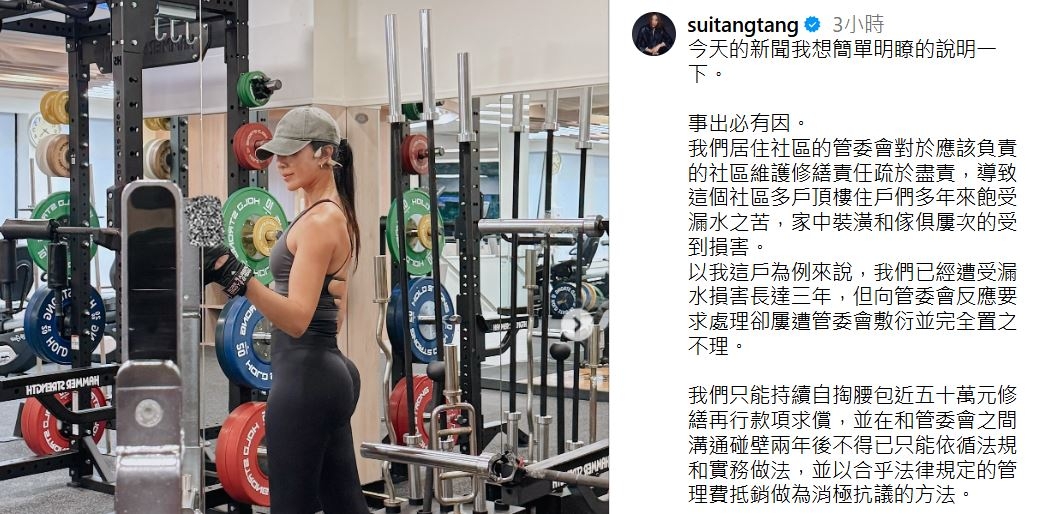 噚日隋棠被爆出積欠近3萬港元管理費,遭管委會多次發函催繳未果,更鬧上法院,其後隋棠喺社交平台火速反擊,積欠管理費事出有因,指管委會對社區維護修繕責任疏於盡責,導致社區多戶頂樓住戶多年來飽受漏水之苦,家中裝潢及家具屢次受損,隋棠表示「以我這戶為例來說,我們已經遭受漏水損害長達三年,但向管委會反應要求處理卻屢遭管委會敷衍並完全置之不理」。