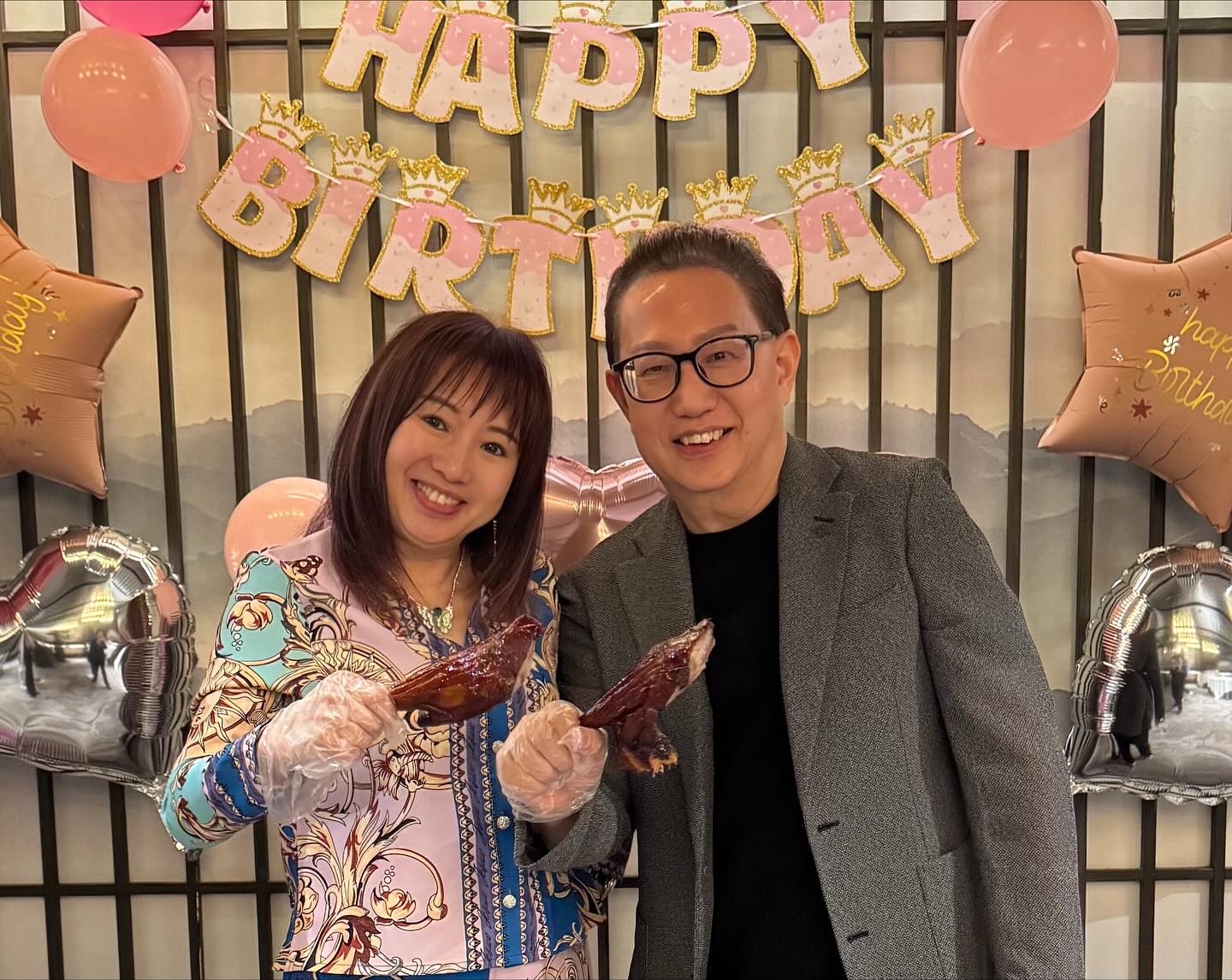 原來呢個咁特別嘅主題,係壽星女早前低調入院接受手術時,許下嘅願望。小青姐喺社交平台分享生日會嘅照片,當中有每人手持一隻燒鵝髀乾杯嘅GIF圖、亦有小青姐同老公劉家豪拎住燒鵝髀嘅合照。![]()