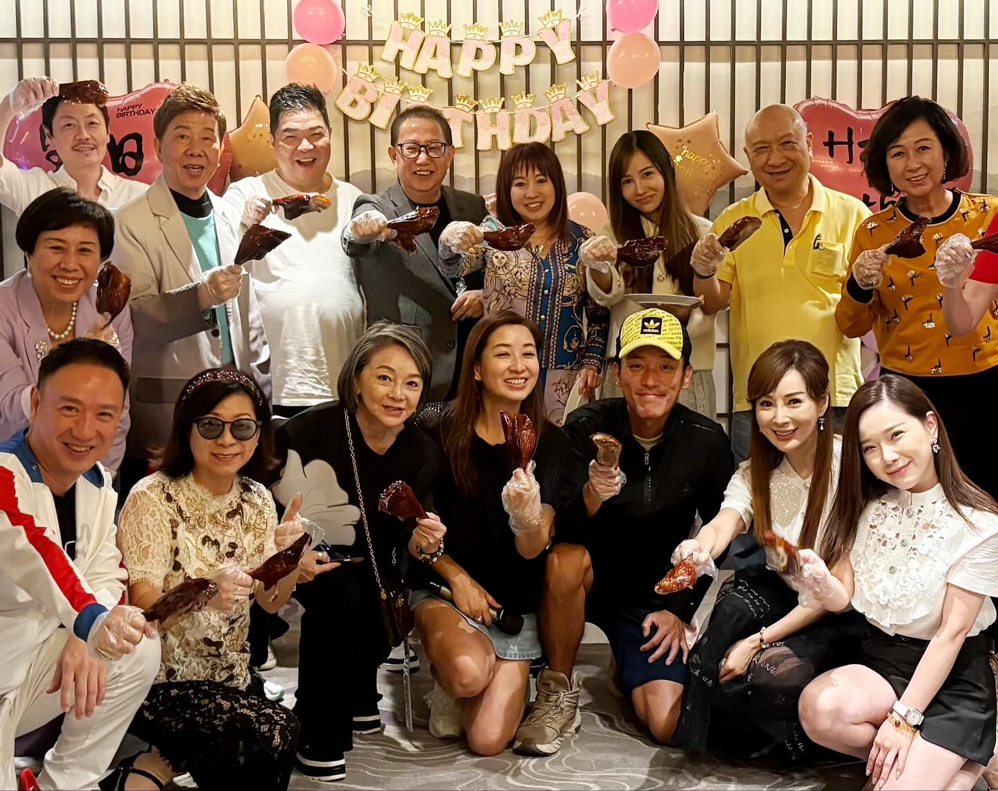 今個月27號係金牌監製梅小青嘅72歲生日,老公劉家豪同一眾好友李思捷、謝雪心、張頴康與太太麥雅緻、羅霖及尹光等,日前就為佢舉行一個以「燒鵝髀」做主題嘅生日派對。![]()