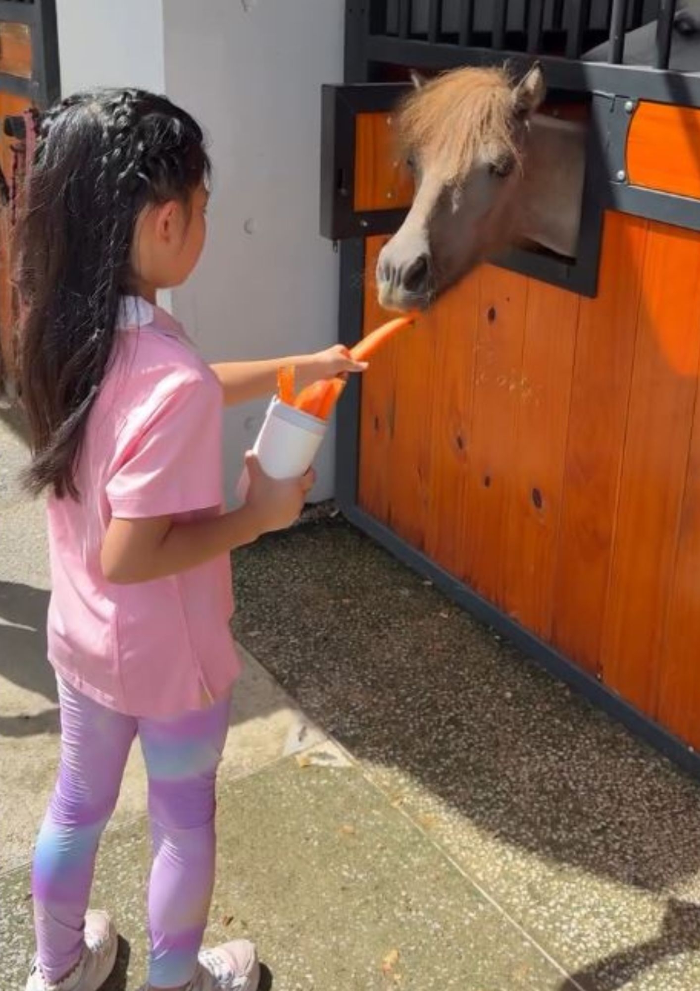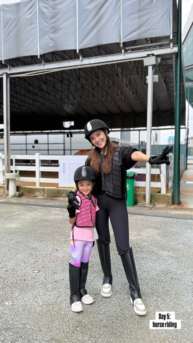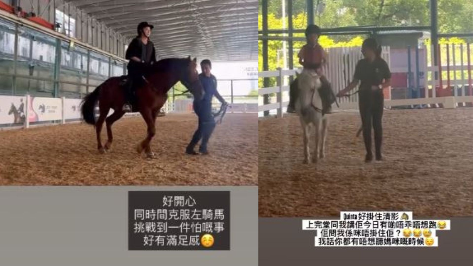 話晒展鵬係前港隊乒乓球手,女兒遺傳佢嘅好動運動細胞,Phoebe就為愛女安排學溜冰,以及被視為「貴族運動」嘅馬術,媽媽Phoebe亦陪伴一齊上騎馬課,Phoebe開心留言:「好開心,同時間克服咗騎馬,挑戰到一件怕嘅事,好有滿足感。」小豬比仲有親自餵蘿蔔,跟馬匹清影培養感情。