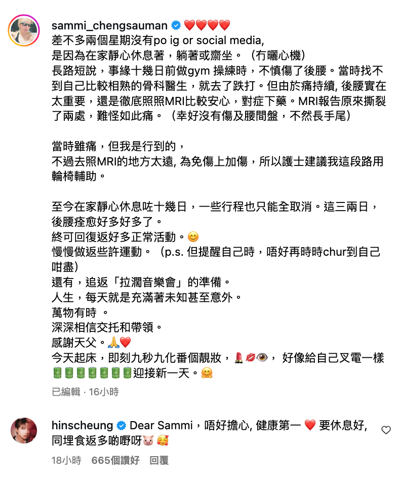 為免大家擔心,Sammi表示自己冇傷及腰間盤,至於坐輪椅嘅原因,係因為距離照MRI嘅地方有啲遠,護士為免佢傷上加上,所以即使佢可以行到,但都建議佢以輪椅代步。![]()