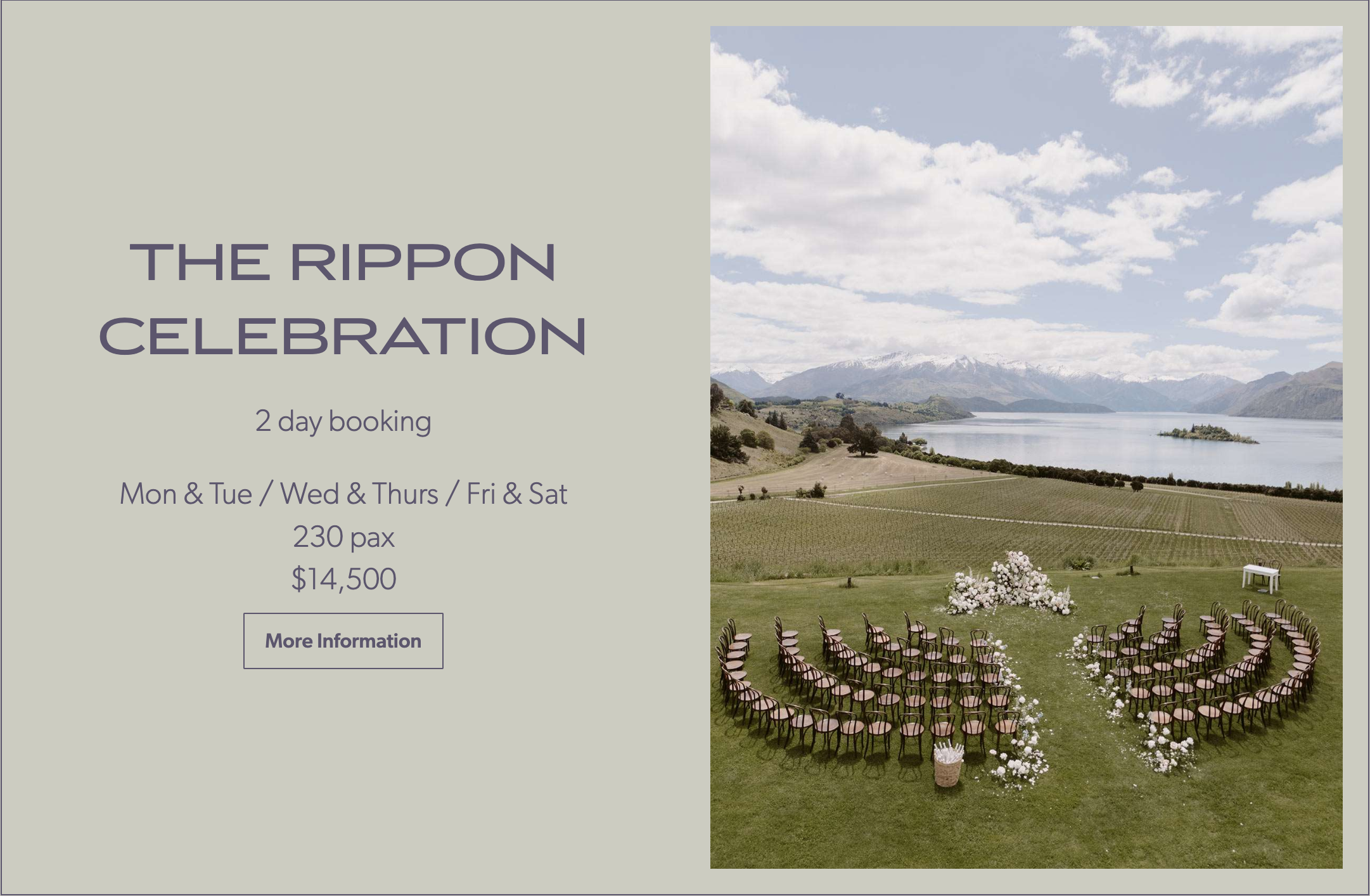據官網顯示,兩日嘅婚禮場地租賃,預訂費用約14,500紐元(約65,00港幣),開闊場地可容納 230位賓客;至於接待同儀式地點則共有三個場地供選擇,當中包括無邊際景觀露天劇場、主廳或帳篷。![]()