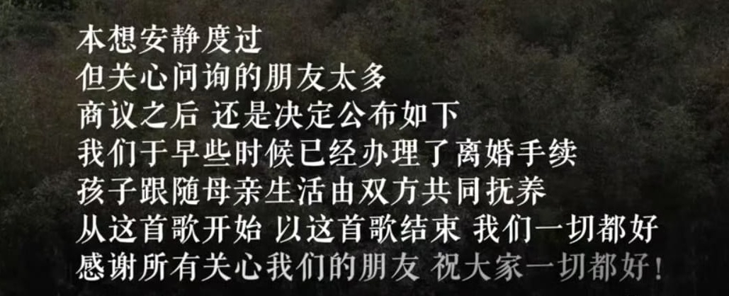 影片以英文歌《Someday》作為背景音樂,並播出聲明:「本想安靜度過,但關心問詢的朋友太多,商議之後還是決定公布公如下,我們於早些時候已經辦理了離婚手續,孩子跟隨母親生活,由雙方共同撫養,從這首歌開始,以這首歌結束,我們一切都好,感謝所有關心我們的朋友,視大家一切都好。」