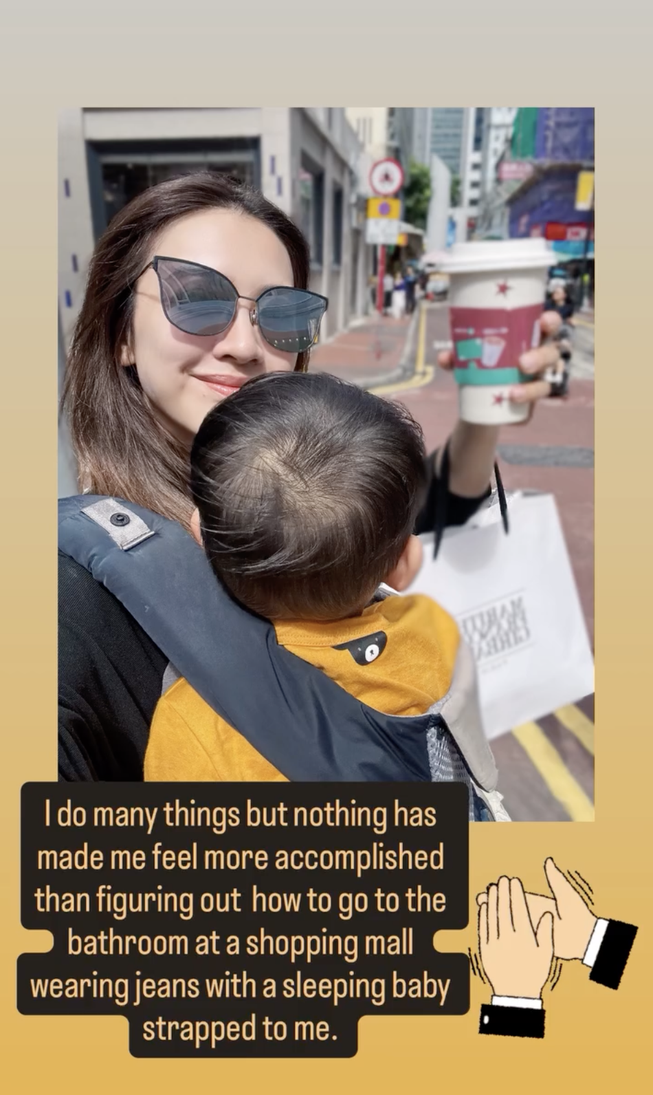 千雪又喺限時動態出Post,指自己完成過唔少目標同工作,不過最近嘅一個成就,就係可以著住牛仔褲又用孭帶湊住瞓著BB嘅同時,可以順利喺商場如廁,對同樣身為媽咪嘅女士嚟講,真係感同身受呀。