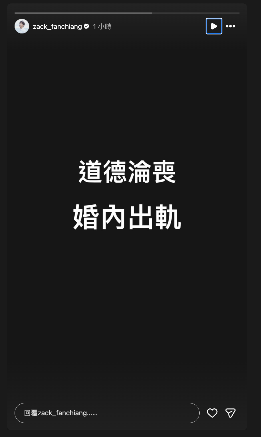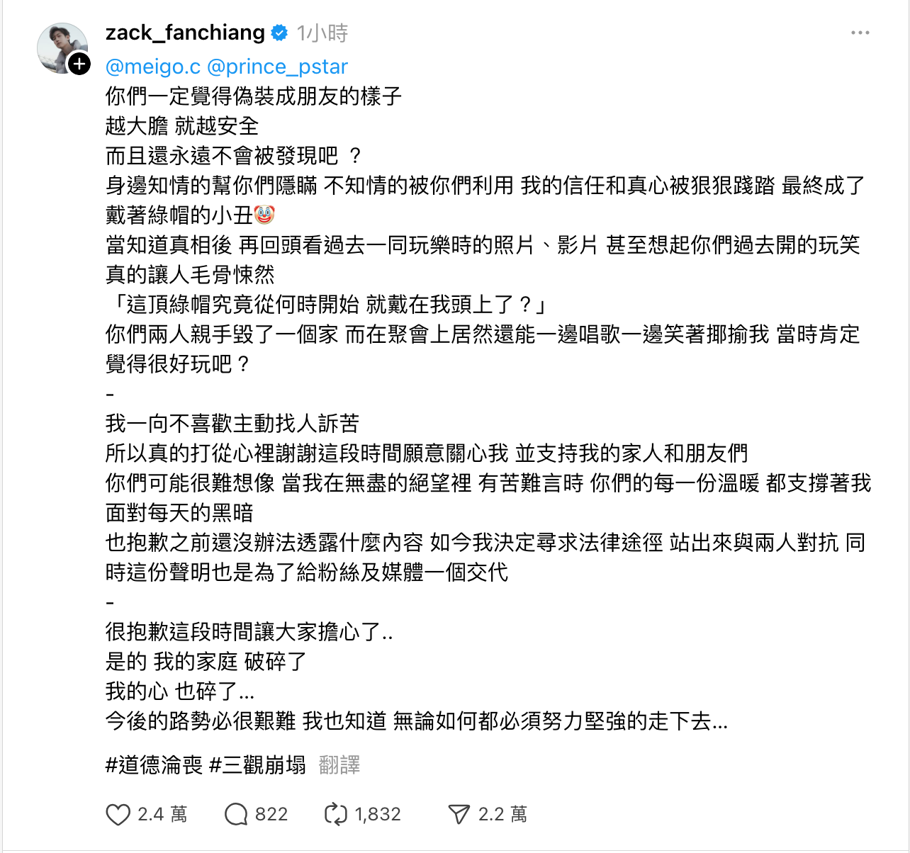 29號台日混血藝人 范姜彥豐 拍片控訴其同為藝人嘅妻子 粿粿江瑋琳 ,婚內出軌好友 王子,並於影片及帖文中@上粿粿與王子。范姜於帖文中寫道:「你們一定覺得偽裝成朋友的樣子,越大膽就越安全,而且還永遠不會被發現吧?身邊知情的幫你們隱瞞,不知情的被你們利用,我的信任和真心被狠狠踐踏,最終成了戴著綠帽的小丑🤡。」![]()