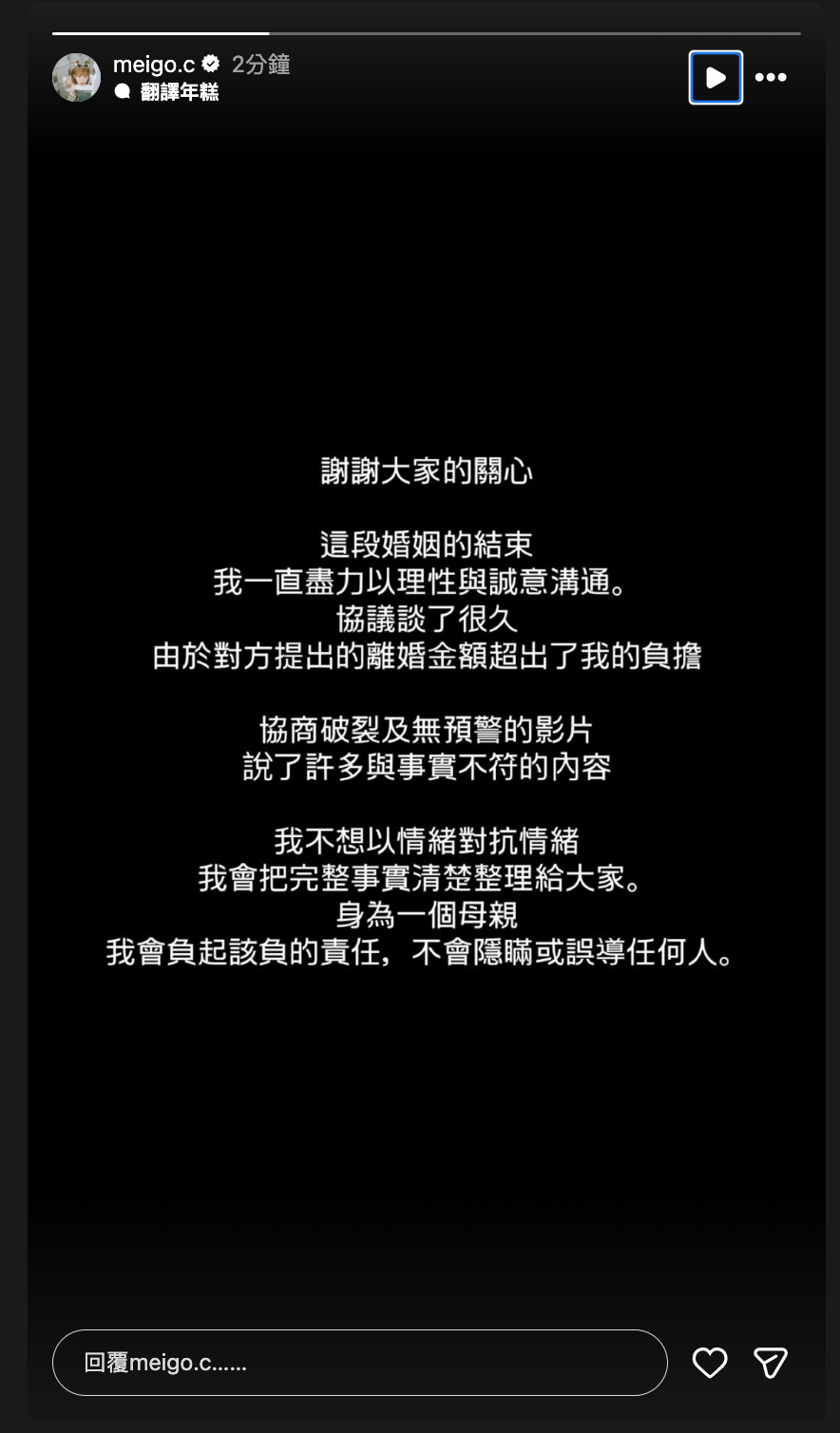 而喺范姜發文後兩小時,粿粿於限動上作出回應:「謝謝大家的關心,這段婚姻的結束,我一直盡力以理性與誠意溝通。協議談了很久,由於對方提出的離婚金額超出了我的負擔,協商破裂及無預警的影片,說了許多與事實不符的內容。我不想以情緒對抗情緒,我會把完整事實清楚整理給大家。身為一個母親,我會負起該負的責任,不會隱瞞或誤導任何人。」![]()