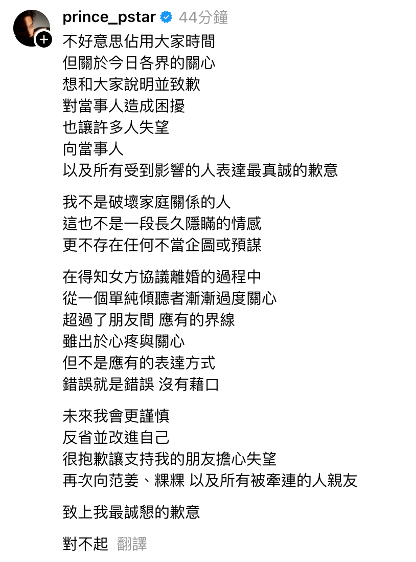 至於事件另一主角王子,亦於社交平台交待事件,並承認與粿粿超過了朋友間應有嘅界線:「我不是破壞家庭關係的人,這也不是一段長久隱瞞的情感,更不存在任何不當企圖或預謀。在得知女方協議離婚的過程中,從一個單純傾聽者漸漸過度關心,超過了朋友間,應有的界線。雖出於心疼與關心,但不是應有的表達方式,錯誤就是錯誤,沒有藉口,未來我會更謹慎,反省並改進自己。」![]()