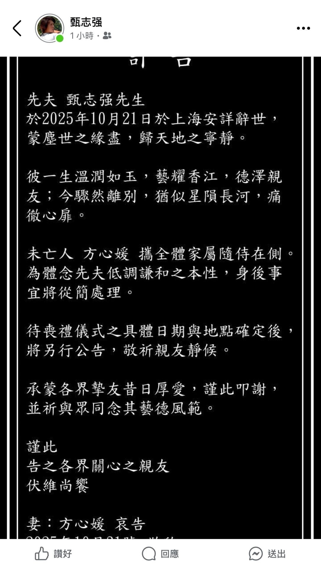 先夫 甄志強先生於2025年10月21日於上海安詳辭世,蒙塵世之緣盡,歸天地之寧靜。彼一生溫潤如玉,藝耀香江,德澤友;今驟然離別,猶似星隕長河,徹心扉。未亡人 方心媛 攜全體家屬隨侍在側為體念先夫低調謙和之本性,身後事宜將從簡處理。待喪禮儀式之具體日期與地點確定後,將另行公告,敬祈親友靜候。承蒙各界摯友昔日厚愛,謹此叩謝並祈與眾同念其藝德風範。謹此告之各界關心之親友伏維尚饗